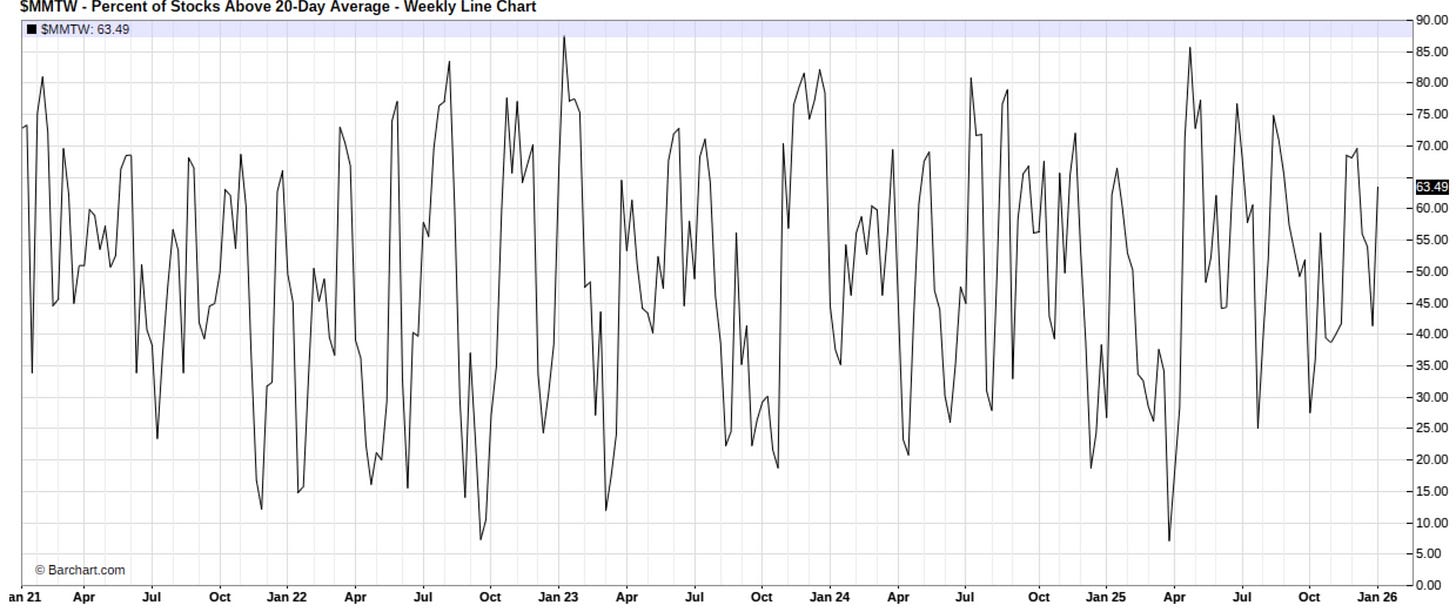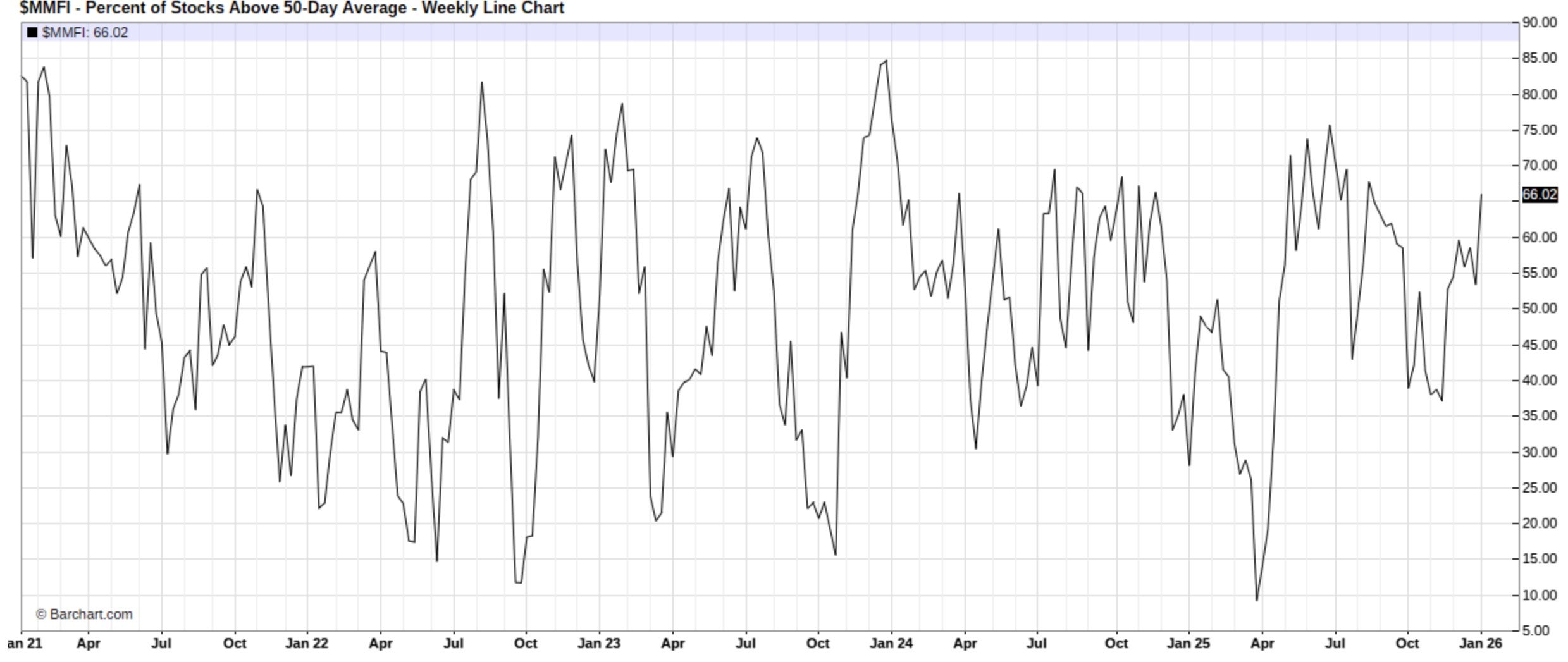 The same can be said on a more broader timeframe as the % of stocks above the 50d has snapped back higher ever since the late November lows near 35% as it now sits at 66% (Peak in last 5-years was December ‘23 near 85% following Powell’s initial signal that the Fed was ready to move toward a rate-cut cycle).