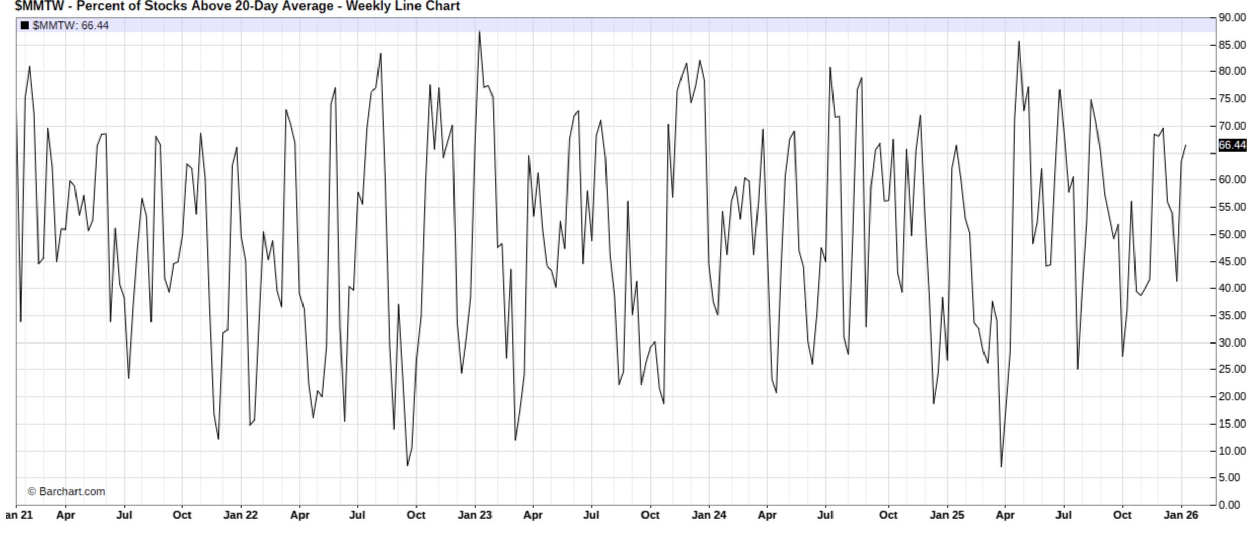 With that being said, despite the lackluster price action within the indices more recently besides Small-caps, overall breadth has continued to remain strong which is made clear given the % of Stocks above the 20D is continuing to slowly encroach overbought territory in the shorter-term, currently sitting at 66%: