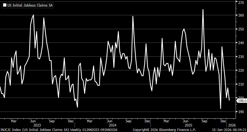 Another interesting datapoint worth highlighting was last week’s jobless claims print which was a clear positive. Initial claims fell again and came in around 198K, pushing back toward cycle lows and reinforcing that the labor market is still tight with layoffs remaining contained.