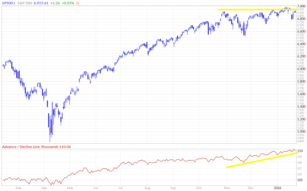 General point being, despite the perceived ‘lackluster’ action amongst the indices (Spooz & the Q’s), besides Small-Caps YTD, capital has instead just flowed elsewhere (S&P 493), which has driven quite the uplift in breadth & overall upside participation, which is made clear, as shown below, given the churn & steady climb higher within the ADV-DECL Line, despite Spooz, for instance, having essentially been flat since late October of ‘25: