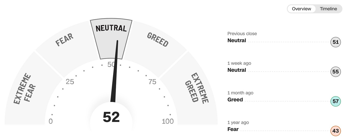 Having said that, despite the broadening out of upside participation amongst the indices, the Fear-Greed index still doesn’t remain as enthusiastic as it currently sits within ‘neutral’ territory: