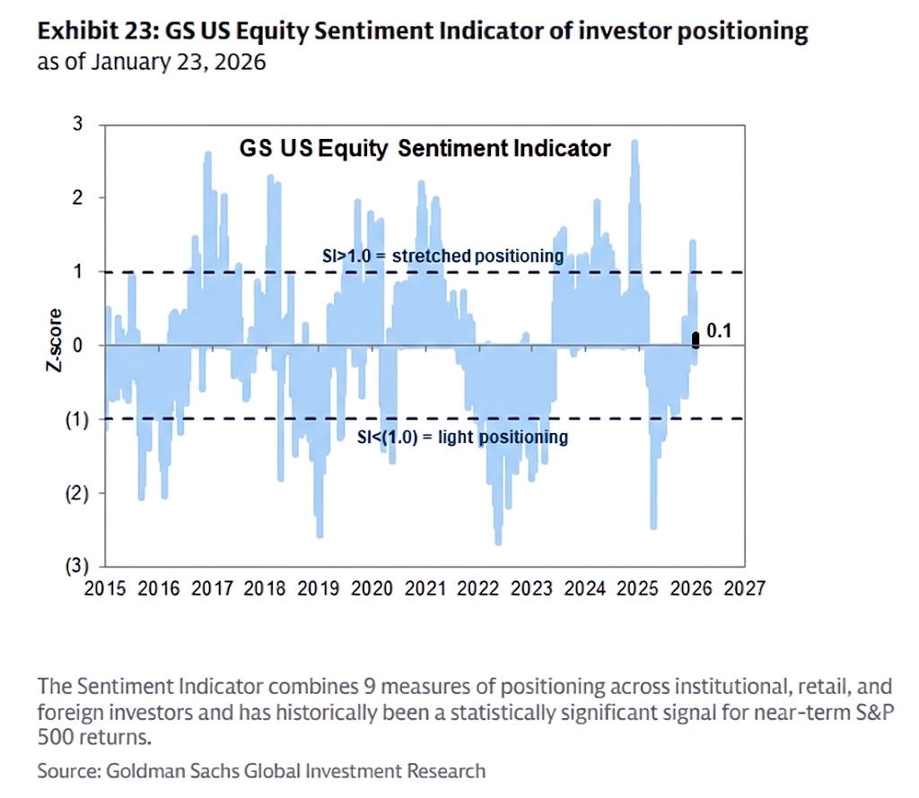 And to add on to this point further, Goldman’s U.S. Equity Sentiment Indicator sits just barely within positive territory & remains far from stretched which emphasizes a market still filled with upside complacency: