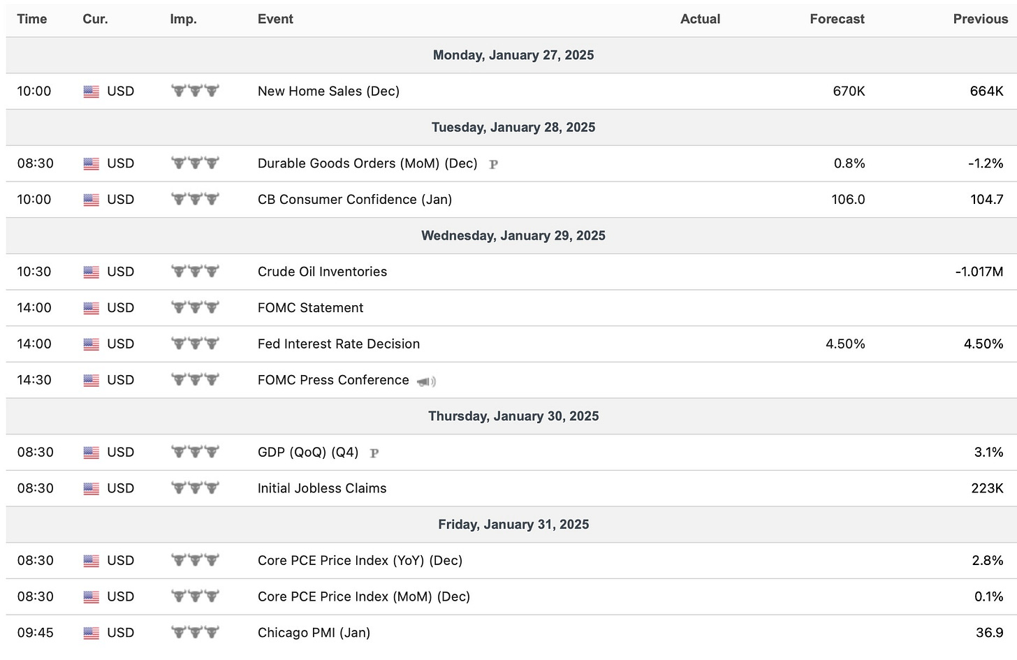 One of the big points Powell brought up this past FOMC is how inflationary tariffs would be… oddly enough, nearly every single Fed speaker has said that tariffs WON’T be inflationary. Trump is likely to stick to using tariffs as a negotiating tactic & he even came out on Thursday night stating that he would rather not have to use tariffs on China… that wasn’t on many individuals bingo cards. Trump has said that he will enact tariffs on Mexico & Canada starting on the 1st of February, but again, it all comes down to the “art of the deal” & there will likely be a deal reached, as again, Trump is more so using the tariff mantra as a way of negotiating (inflationary fears over tariffs are overdone & we’ve started to see that reflected in the dollar which was down over 250bps this past week).