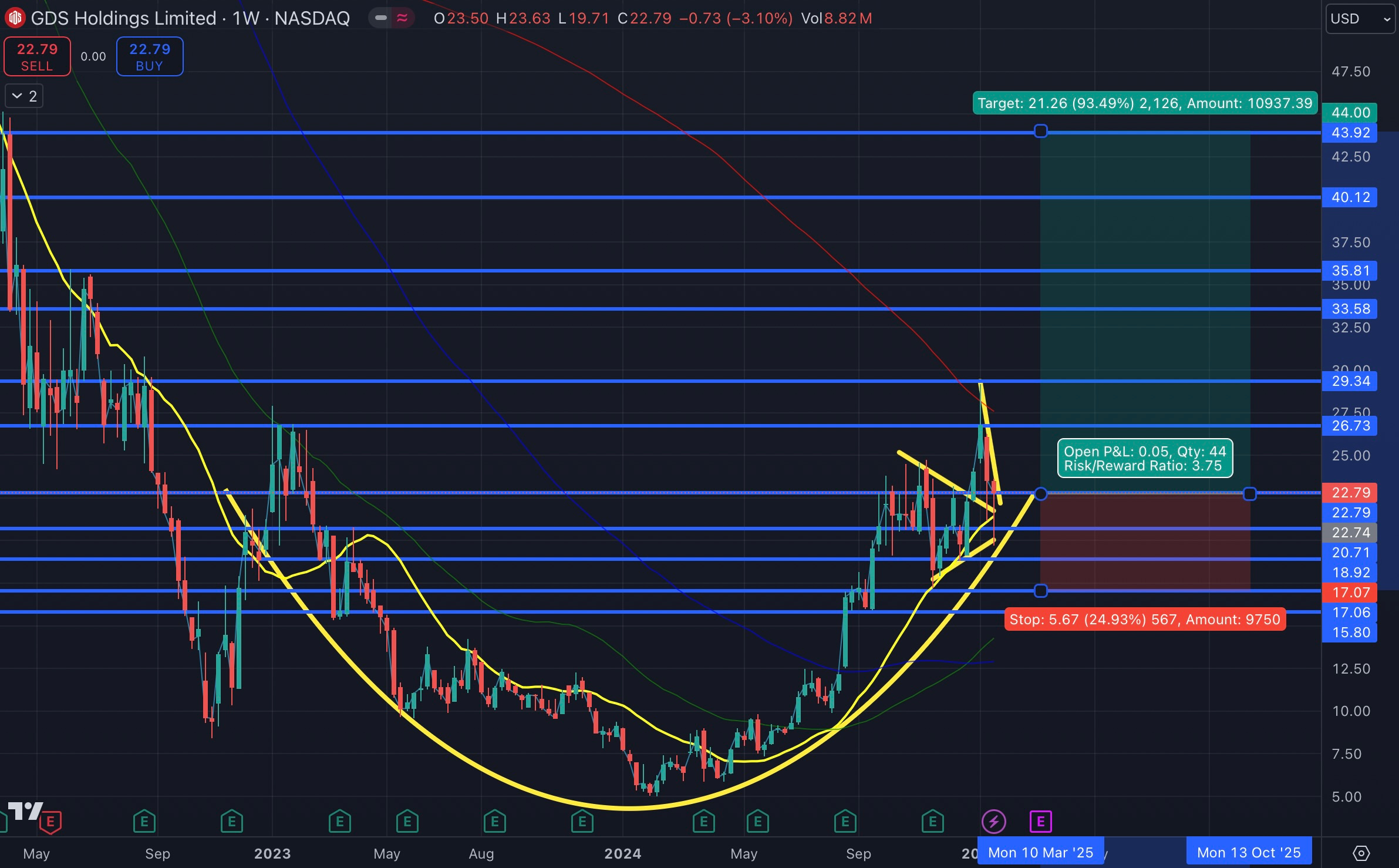 In respect to technicals, GDS recently broke out of a tight 3+ month consolidation before being met with resistance at the 200wk & GDS has since faltered lower & is now backtesting that breakout as it wedges right into the 20wk… risk on the setup essentially being a loss of the prior local range lows made in October with interim and extended targets above for a 3.75 risk-reward ratio (long against 17 to target 44)… between Trump backing off on China tariffs being an added tailwind in general for China equities along with the recent increased excitement surrounding China in regard to AI, GDS seems like an obvious beneficiary & a name that wouldn’t be of too much surprise if it went on to double from here.