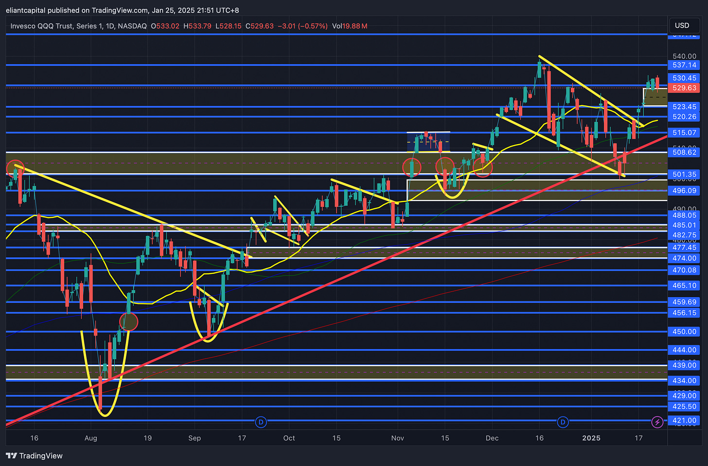 So, I do think Deepseek is worth paying attention to, as at the end of the day, the market tends to be a shoot first / ask questions later, & if we see further development of headlines, that likely could bring about further weakness in the Q’s / Tech leaders… but for now, the Q’s ended up breaking firmly to the upside this past week, although still didn’t quite manage to fill the FOMC gap near 535ish as it fell just short, but the headline of “500B in AI Infrastructure Spend” created a large bull-gap in the Q’s, which as we know, as long as bull-gaps remain supportive, bulls will continue to remain with edge and I think its the same story here. I think if the Q’s hold this bull-gap firmly below (call it 530ish), we should continue to see the Q’s work to fresh highs & a measured move likely propels the Q’s towards upper-540s / 550s range if it were to materialize & we were to see firm followthrough on the upside… on the contrary, if the bull-gap below were to falter (closed right on the bull-gap Friday), we likely will see the Q’s revert lower to the lower-520s & potentially go on to backtest the 50d / 20d around 518ish before finding / establishing a more firm support below.