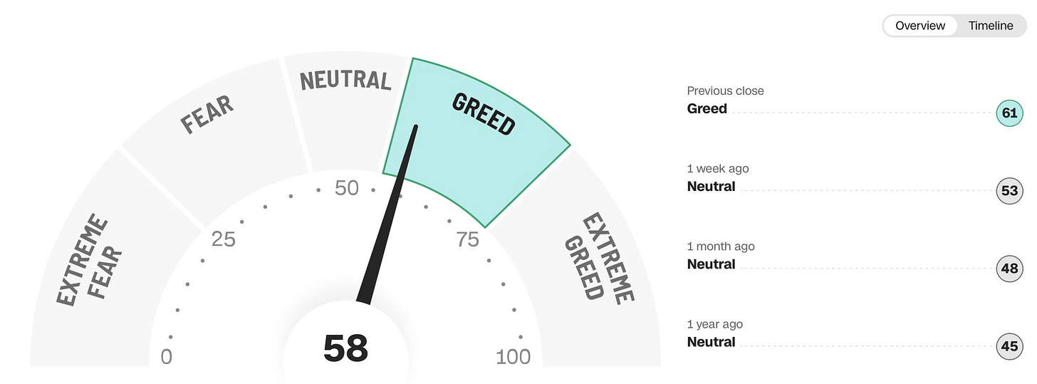 And the Fear-Greed index underscores the point above (Overbought working back to Neutral & shorter-term encroaching Oversold) as the index sits just barely within ‘Greed’ territory (Most of recent uplift due to outperformance amongst Tech & Mag-7) :
