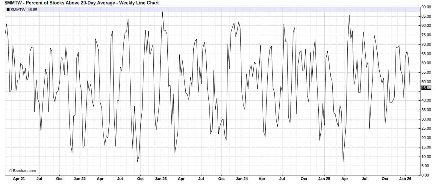 It’s been a wild start to the year to say the least & on that note, action within the indices more recently has been choppier & even despite the indices essentially all sitting near their highs, we’ve seen a correction underneath the hood take place as just 46% of stocks currently remain above the 20D which is nearly starting to encroach oversold territory: