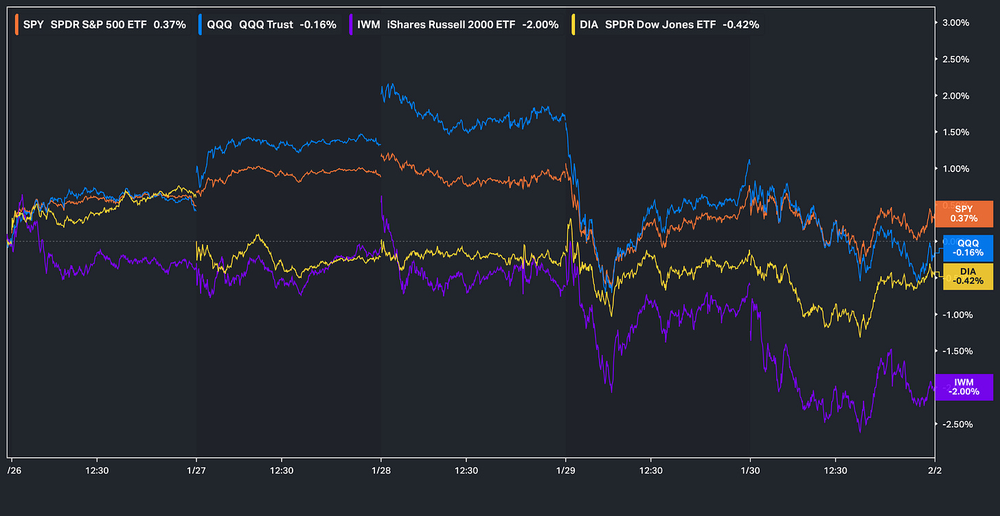 Looking back at this past week, despite the lack of economic data & relatively uneventful FOMC meeting midweek, the bigger ‘theme’ of the week was a continued rotation toward Tech over Small-caps & Cyclicals which were the initial best performing groups the first 2-weeks into the year before then more recently capital started shifting back toward tech. Having said that, the other ‘event’ which drove action in the latter part of the week was the selection of Warsh as the new Fed Chair in which the indices reacted only slightly negative but the ‘real’ pain came amongst the precious metals & commodity complex in which historic records were set in respect to declines.