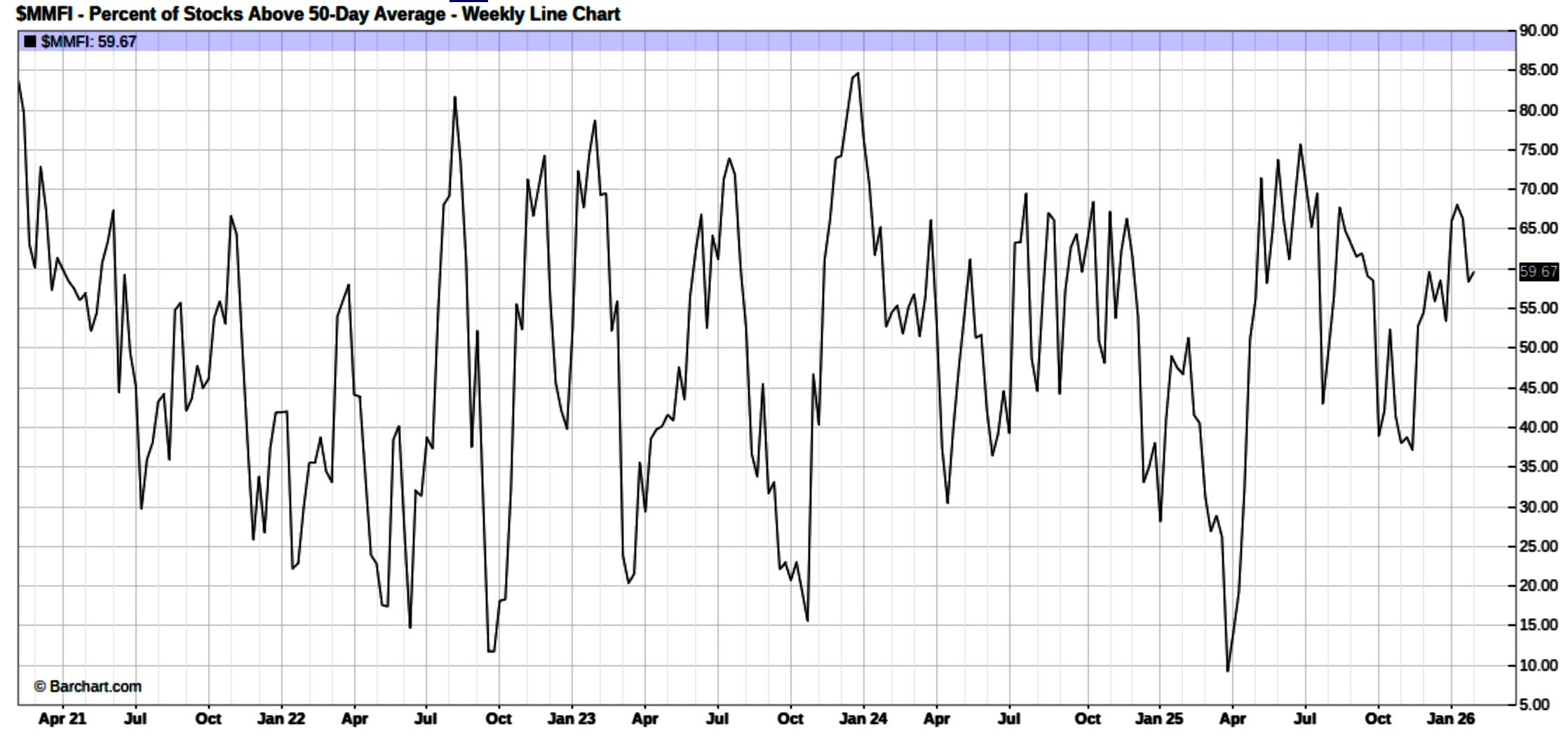 And similar can be said on a more broader timeframe as well as despite the lackluster action amongst both Spooz & the Q’s, still 59% of stocks remain above the 50D which highlights a market slightly in neutral territory after having recently come out of overbought territory. Again, this is mostly attributed to the broadening upside participation amongst the indices despite Tech specific sectors / Overall AI-Trade / MAG-7 performing lackluster YTD: