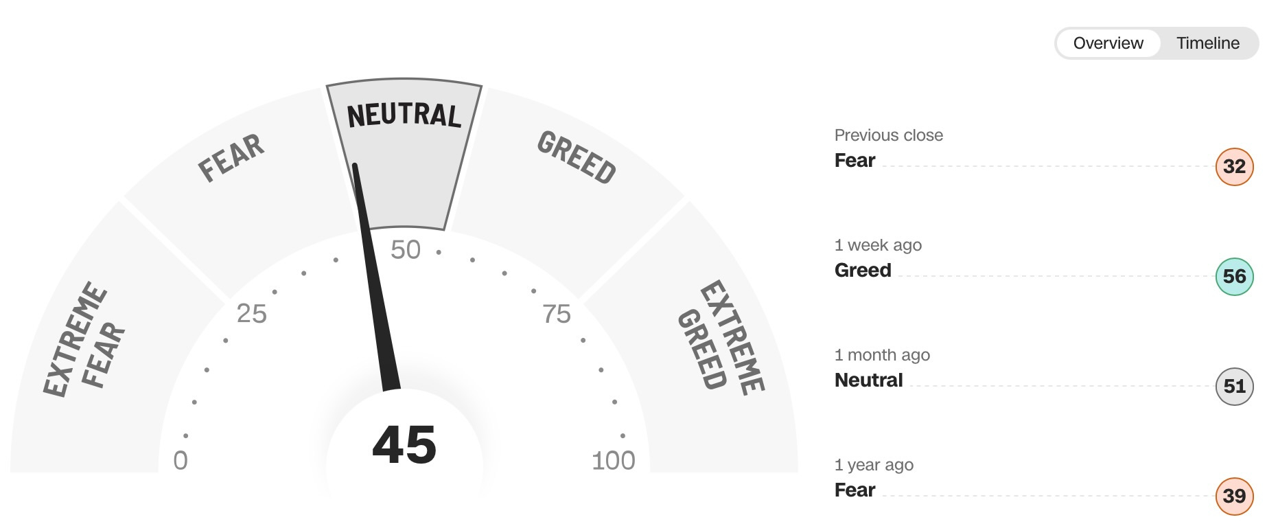 And the Fear-Greed index underscores the point just above as well as despite the % of stocks above the 20D & 50D remaining healthily in neutral territory, the Fear-Greed index sits barely within ‘Neutral territory’ after having recently come out of ‘Fear’ territory following the recent unwind just this past week: