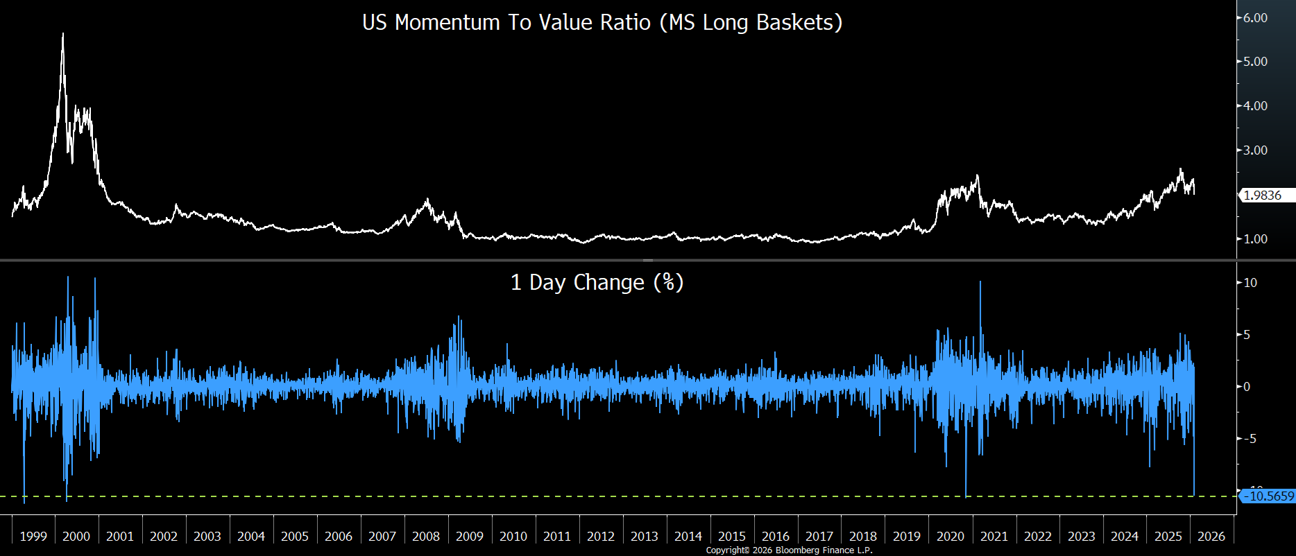And another chart reinforcing the point above but this past Thursday marked the 4th worst one-day momentum vs value drawdown since ‘99, based on Morgan Stanley’s long baskets: