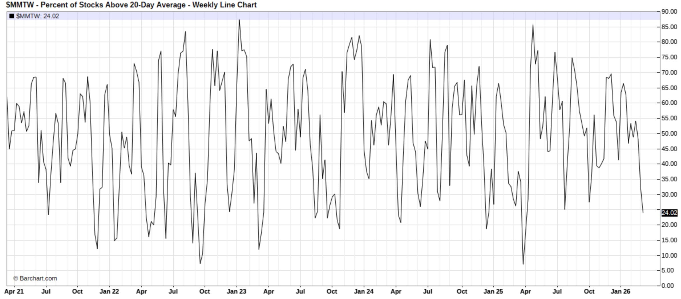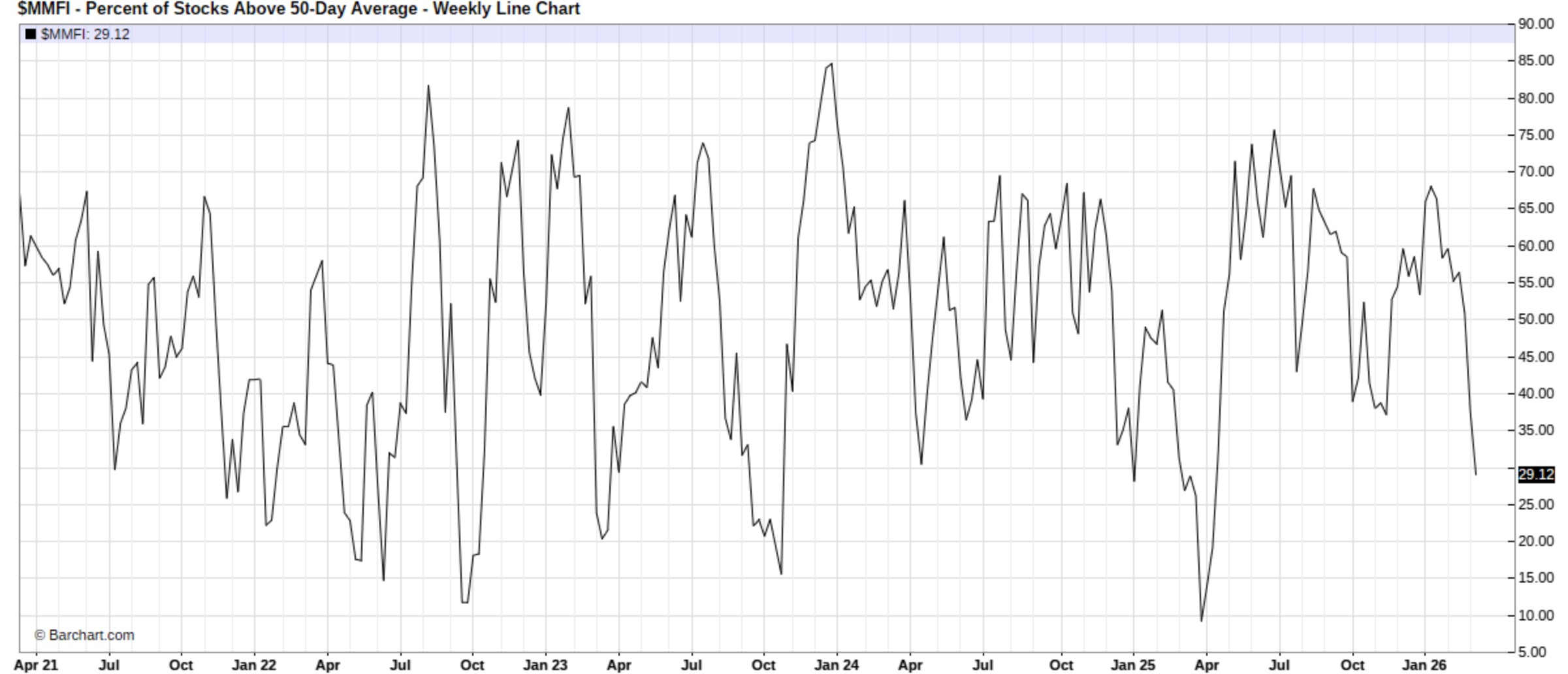 Looking back historically, readings can occasionally fall into the single digits during more extreme washouts, but generally speaking levels in the 15–30% range tend to signal that the market is becoming increasingly oversold, although not yet at full ‘washout’ levels.
