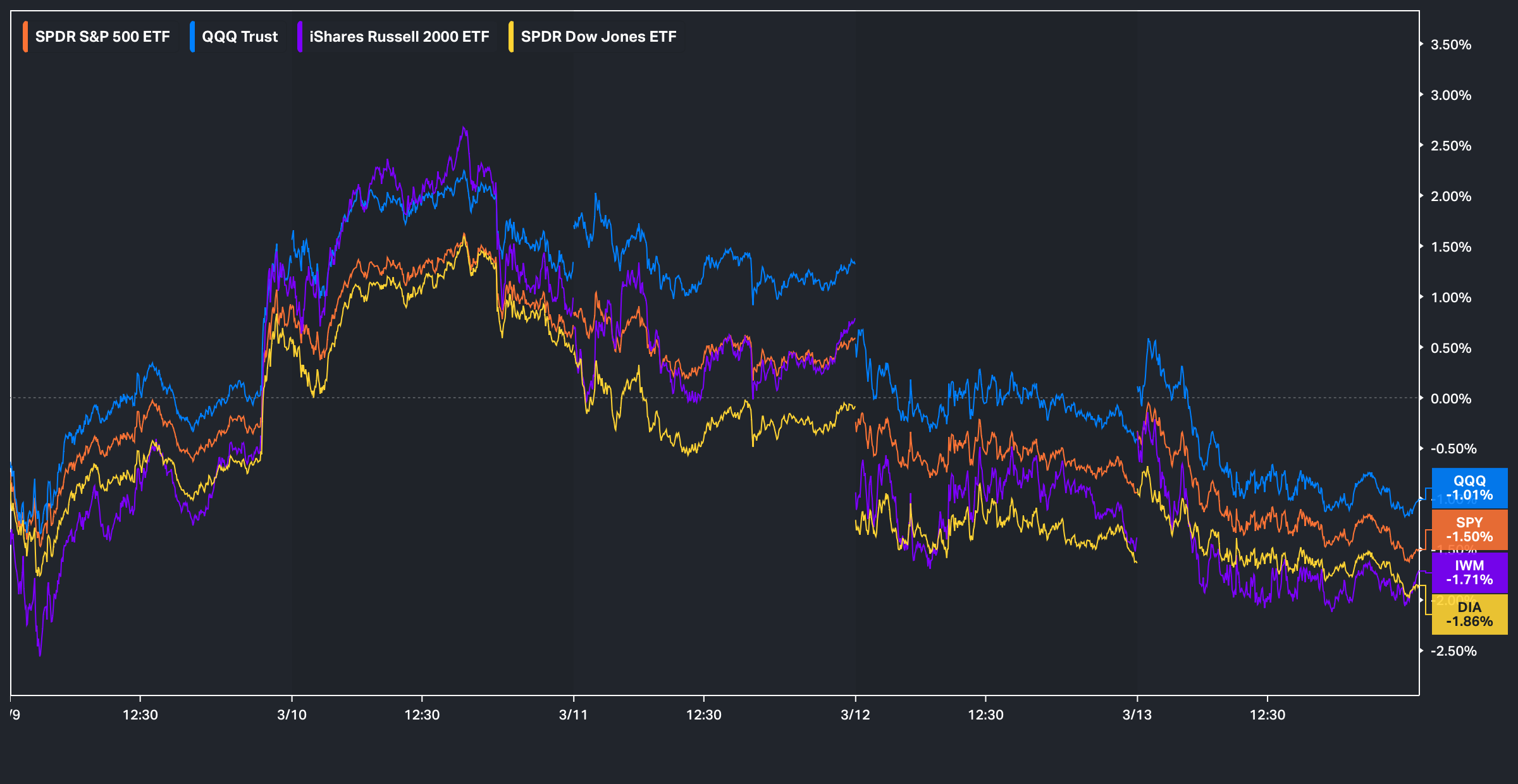This past week was yet another eventful one geopolitically as tensions between the U.S. and Iran continued to escalate. Over the weekend in particular, markets experienced a brief wave of panic as oil prices surged nearly 30%, while equities fell roughly 3-4% across the board in the overnight session heading into Monday. However, rumors of a coordinated global SPR release, along with comments from Trump suggesting the war could be nearing an end, helped spark a sharp rebound in risk assets earlier in the week. That said, the rally faded through the latter half of the week following Iran’s threats to place sea mines in the Strait of Hormuz and continued escalations from both the U.S. & Iran. With traffic through Hormuz still disrupted, markets gradually drifted lower, leading to a slow bleed across the indices into the end of the week.