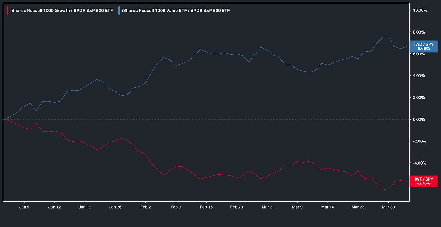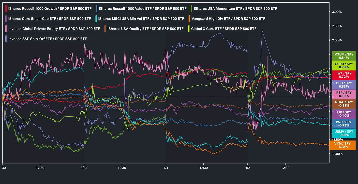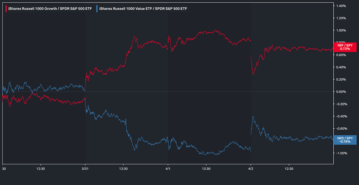 And on the week, given the snapback rally within the indices, Growth ended up outperforming Value on the week with the spread between the two groups sitting just under 150bps: