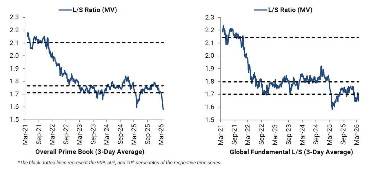 And more notably, hedge funds have aggressively increased short exposure, pushing their long/short ratio to the most bearish level on record, even exceeding the extremes seen during the Liberation Day selloff.