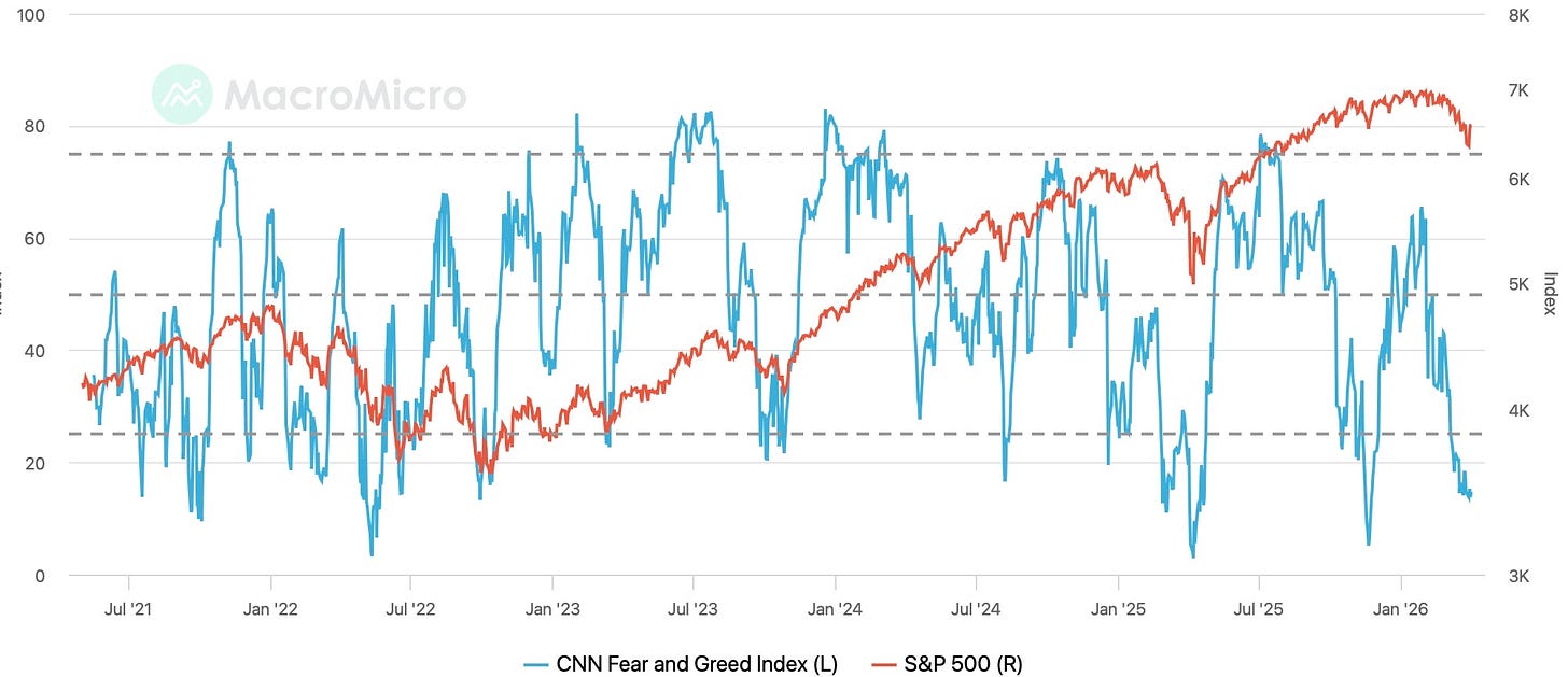 And continuing on that note, even with the indices having worked into corrective territory this past week, although with the recent snapback higher, Spooz is only down 6% from all-time highs, we still remain well into ‘extreme fear’ territory.