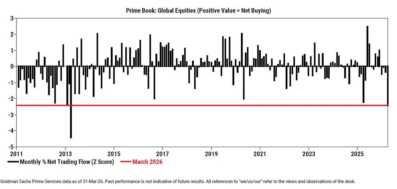 That said, with March now behind us, positioning tells a much more extreme story than price action alone, as while performance was weak, flows were far worse, with global equities seeing the largest net selling in over a decade and among the most aggressive since ’11, while hedge funds were net sellers for a fourth straight month, cutting exposure at the fastest pace in 13 years.