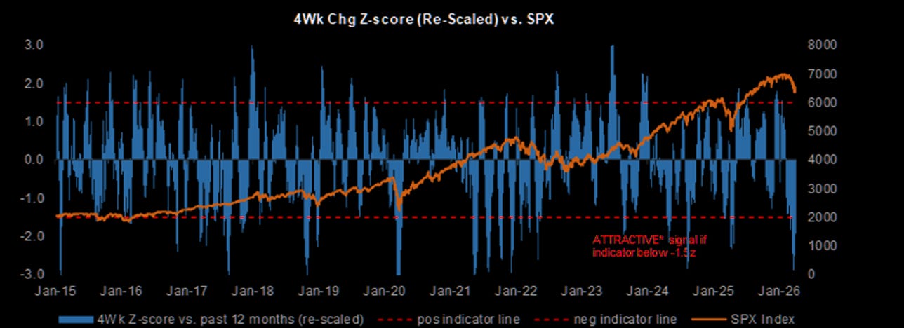 And tying this into positioning more broadly, the message is reinforced by JPM’s positioning monitor as well, with the 4-week change in their U.S. Tactical Positioning Monitor reaching nearly -3z, marking one of the most bearish readings on record.