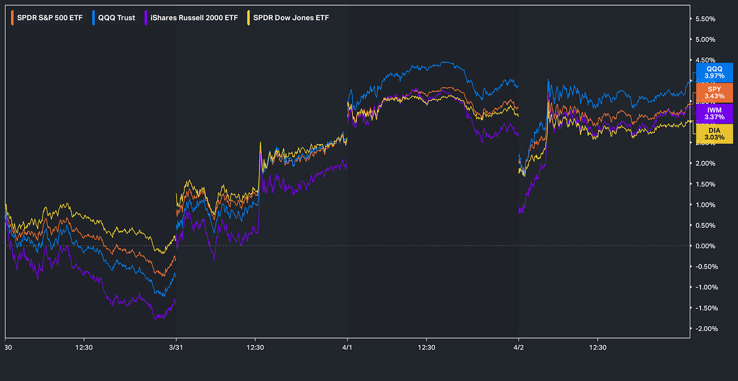 Since starting this Substack back in June of ‘23, between individual names / tactical trades / baskets, we have netted a 174.70% return whilst in the same period, the Q’s have returned 66.21% / Spooz has returned 57.38% / Dow has returned 44.41% & Small-caps have returned 43.69%, so nice outperformance against all the indices whilst having a 81.9% win rate, averaging a 28.13% return on realized gains / winners & a 15.49% loss on realized losses / losers.