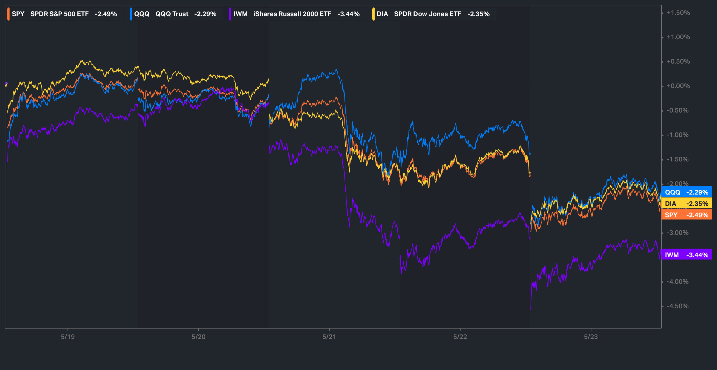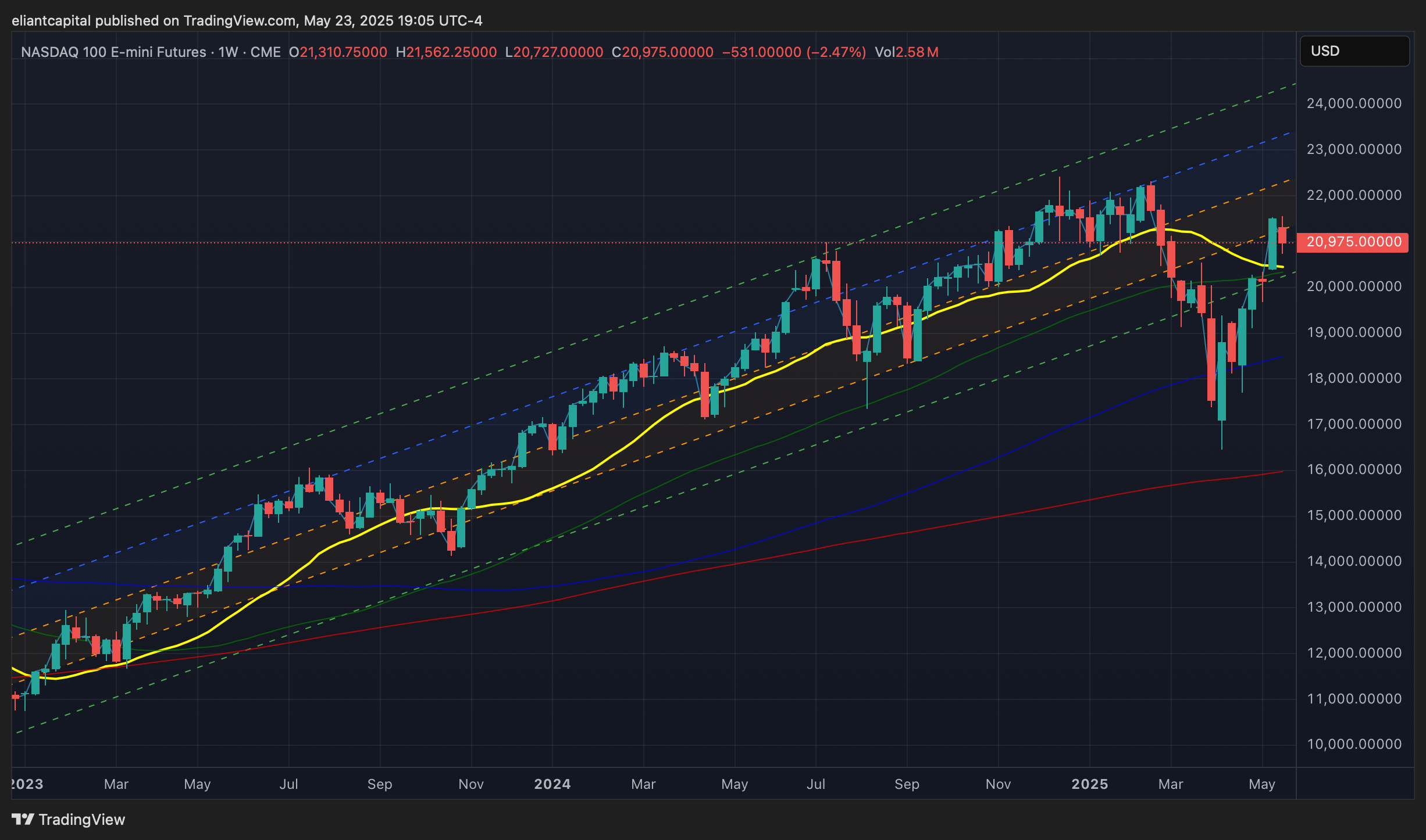 Looking back at this past week, we saw a bit of a pick-up in volatility following the poor bond-auction results mid-week which caused the indices to selloff & work-off the recent overbought conditions thus bringing conditions to a more neutral stance… then to add on to the end of week pressures, Trump threatened Apple with 25% tariffs and then the EU with 50% tariffs starting June 1st… as a result, we saw the indices gap lower on Friday & the worst performing of the indices on the week was small-caps which closed lower by 344bps & the ‘best’ performing of the indices was the Q’s although the Q’s still closed lower by 229bps to round off the week.