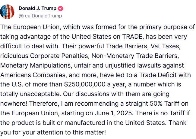 In regard to other news, to round off the week on this past Friday, Trump threatened Apple with a 25% tariff to motivate to bring back mfg. to the U.S. & on top of that, Trump threatened the EU with 50% tariffs starting June 1st as the EU has been ‘difficult to work with’ thus bringing back tariff uncertainties… question from here being whether or not the EU retaliates & or if the 50% threat makes the EU willing to negotiate / sweeten terms to try and strike an interim deal with the U.S.