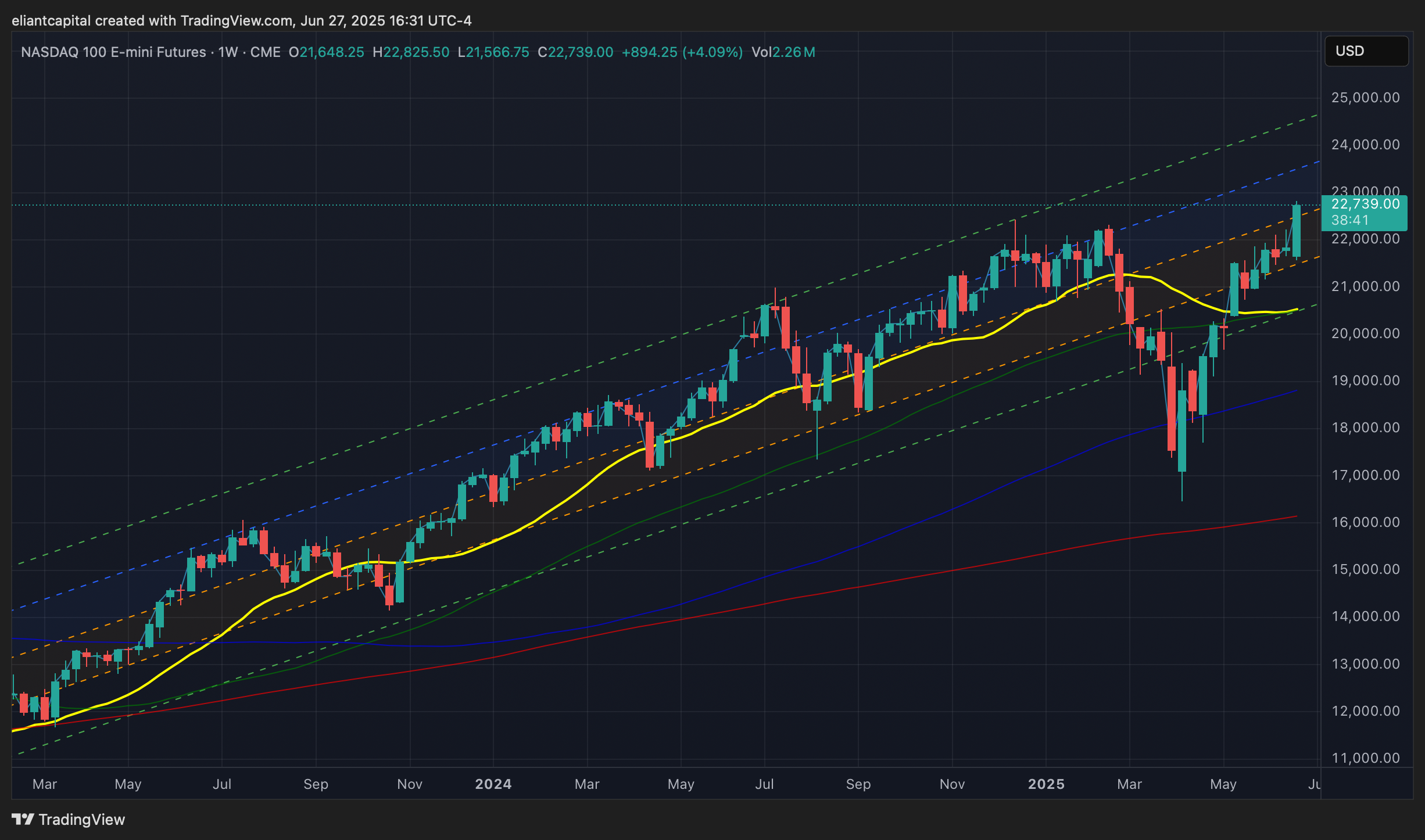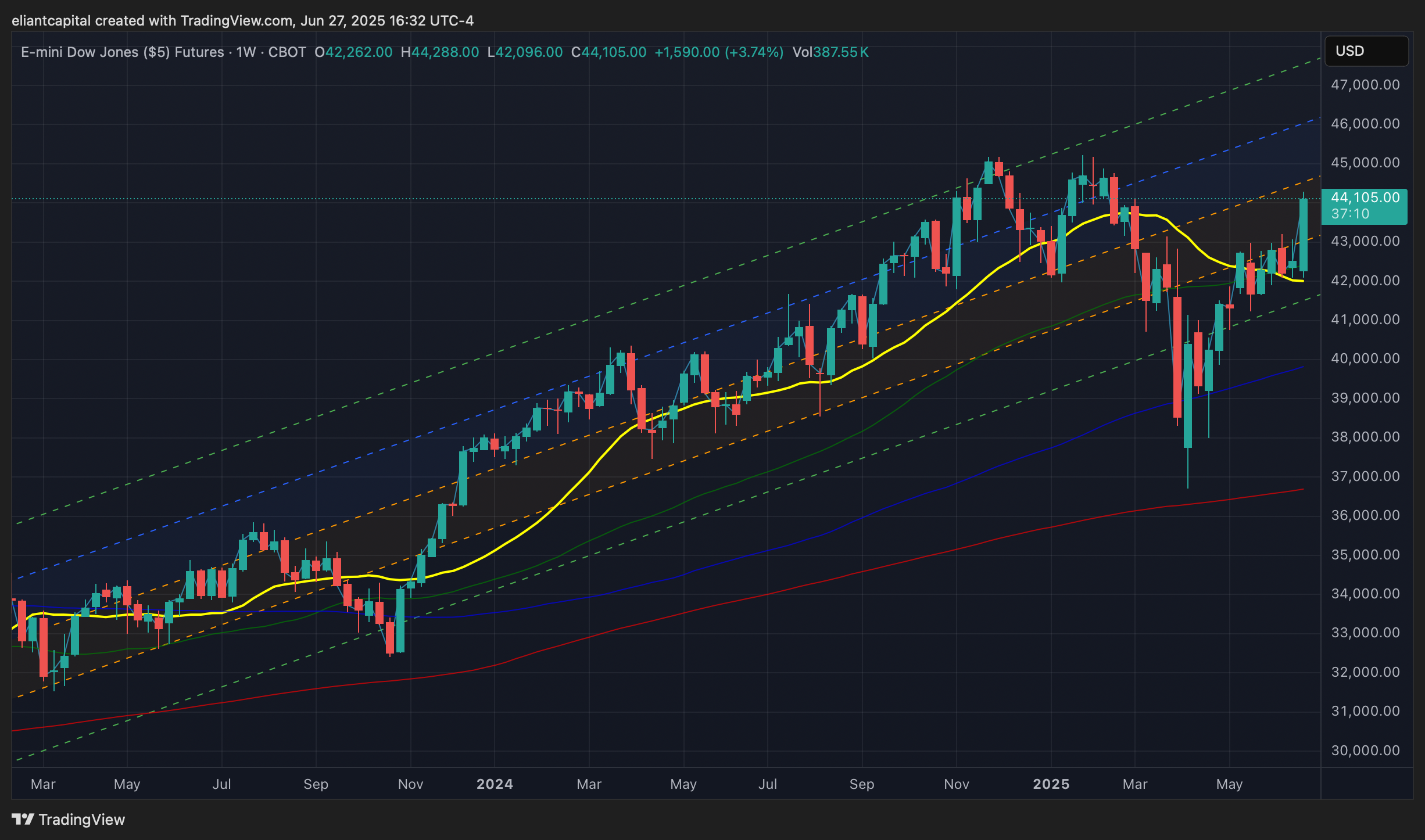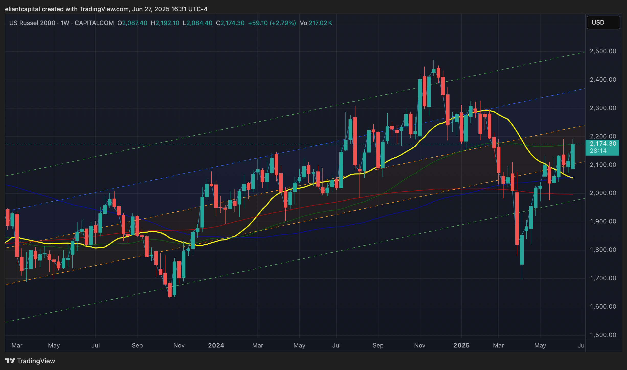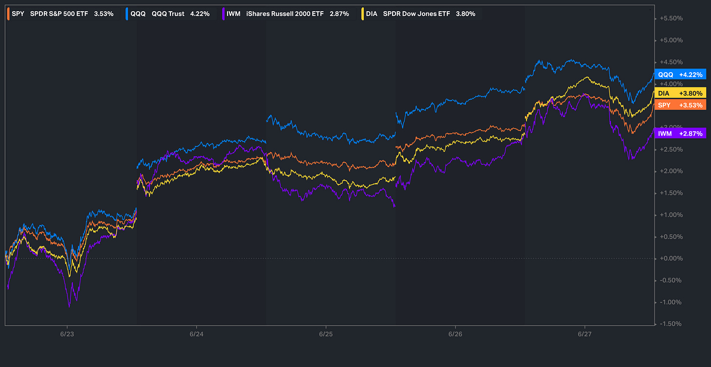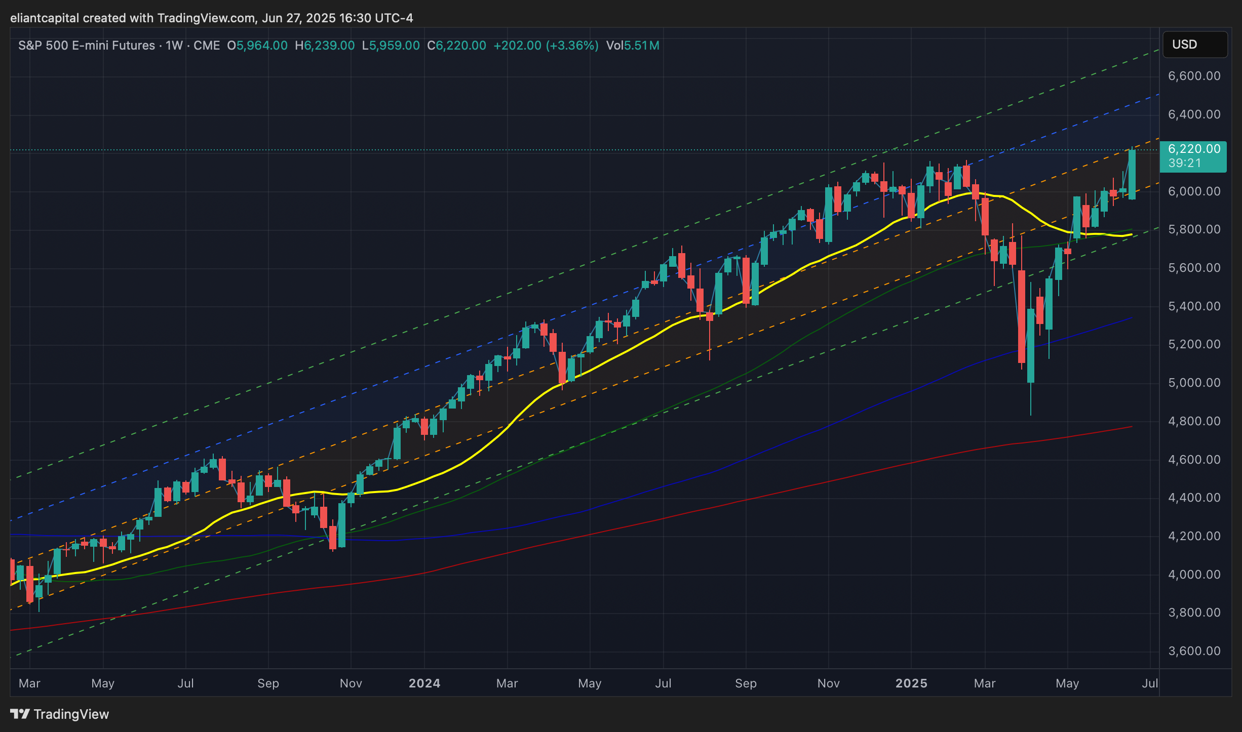 Last week ended up being quite the week for the indices as initially coming into the week, fears & or headline-driven hysteria following the U.S. having joined in on the attack against Iran led indices to dip earlier on in the week & then following the retaliation by Iran, it ended up marking the bottom on the indices for the week as the attack more so was an escalate-to-de-escalate for Iran to save-face & as the week progressed, focus shifted towards the dovish comments by the Fed (Waller & Bowman suggesting July rate-cut on table) along with Trump looking for Powell’s replacement already & because of the excitement around dovishness / rate-cuts, indices continued to trek higher & both Spooz & the Q’s went on to make new ATHs although the Q’s led the indices on the week by closing higher by 422bps whereas Small-caps were the weakest of the indices although still closed higher by 287bps on the week.