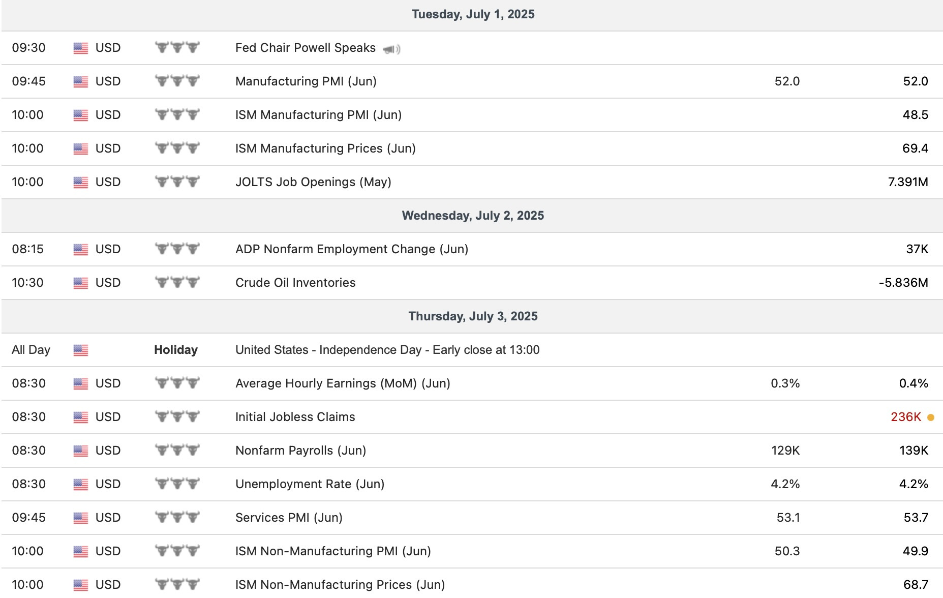 As we get ready to head into the upcoming week, for starters, it is a shortened week as markets will close early on Thursday for a half day and markets will remain closed on Friday for the holiday. In regard to economic data, we have a full slate of jobs and labor market data scattered throughout the week, and most importantly, we have NFP #’s on Thursday. The other major event unrelated to economic data is the administration’s BBB (Big Beautiful Bill) which they hope to get passed by the Fourth of July. We will see how that ends up shaping up.