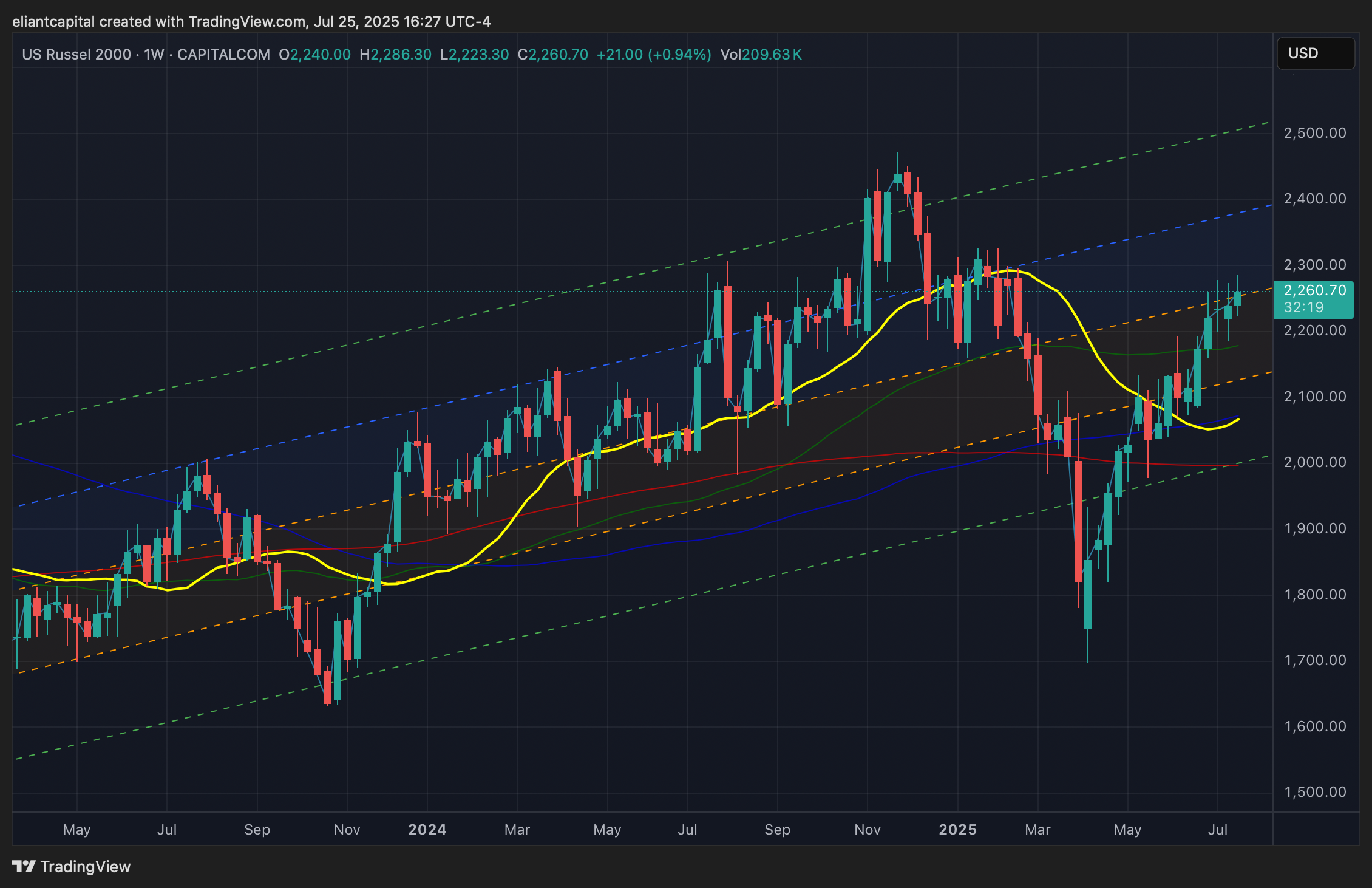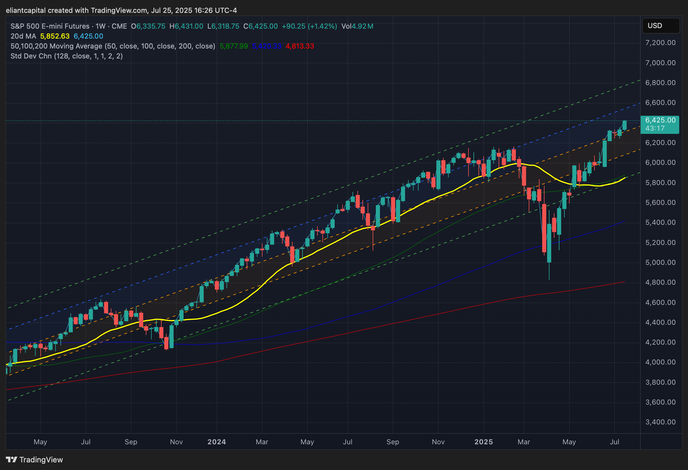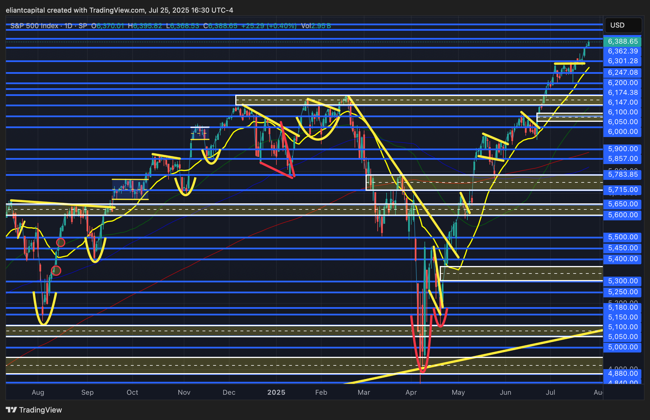 To jump into Spooz, well, yet another new ATH was achieved this past week as each & every dip continues to remain shallow & bought & Spooz & the general indices have more so continued this slow churn / grind higher pattern. The biggest news from this past week was a deal with Japan was finally reached & over the weekend, Trump is expected to meet with the EU to try and finalize a deal in which Trump specifically said it’s 50/50 at this stage, but nevertheless, the general summary from this past week in terms of important trade partners in which the market specifically cares about is the trade-war is nearly wrapped up… Again, Japan deal reached / Progression with the EU over the weekend & then per Bessent, China’s August 12th expiration plans to be extended to allow for further progression in talks & because of the developments from this past week, August 1st tail-risk has drastically deflated hence indices continued to just grind higher as the week progressed with Spooz & the Q’s closing out at new ATHs.