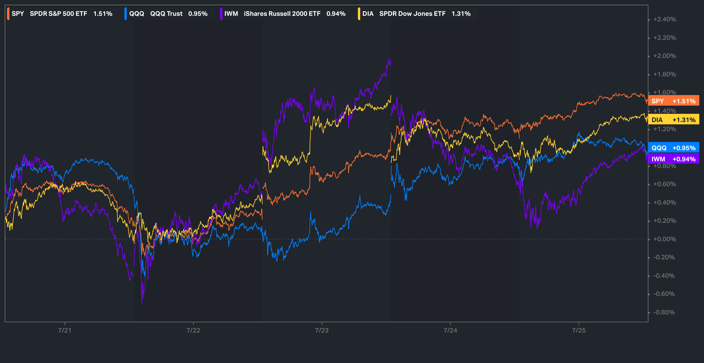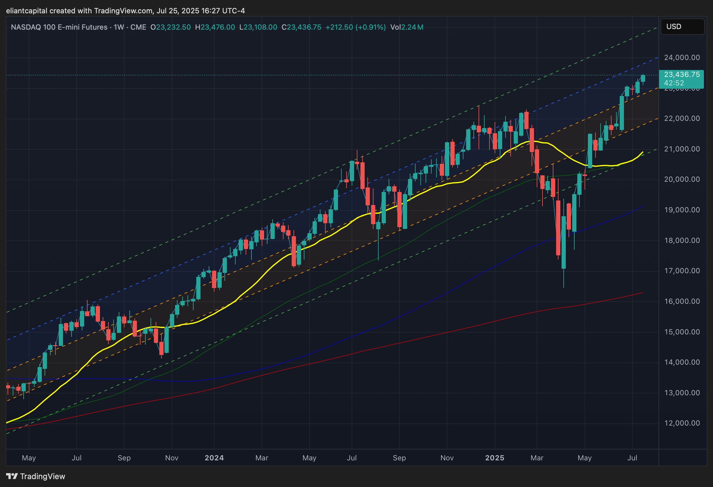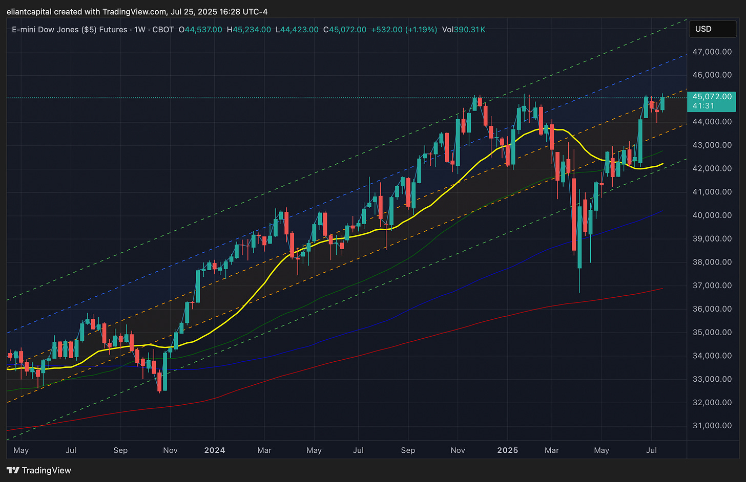 To jump into Spooz, well, yet another new ATH was achieved this past week as each & every dip continues to remain shallow & bought & Spooz & the general indices have more so continued this slow churn / grind higher pattern. The biggest news from this past week was a deal with Japan was finally reached & over the weekend, Trump is expected to meet with the EU to try and finalize a deal in which Trump specifically said it’s 50/50 at this stage, but nevertheless, the general summary from this past week in terms of important trade partners in which the market specifically cares about is the trade-war is nearly wrapped up… Again, Japan deal reached / Progression with the EU over the weekend & then per Bessent, China’s August 12th expiration plans to be extended to allow for further progression in talks & because of the developments from this past week, August 1st tail-risk has drastically deflated hence indices continued to just grind higher as the week progressed with Spooz & the Q’s closing out at new ATHs.