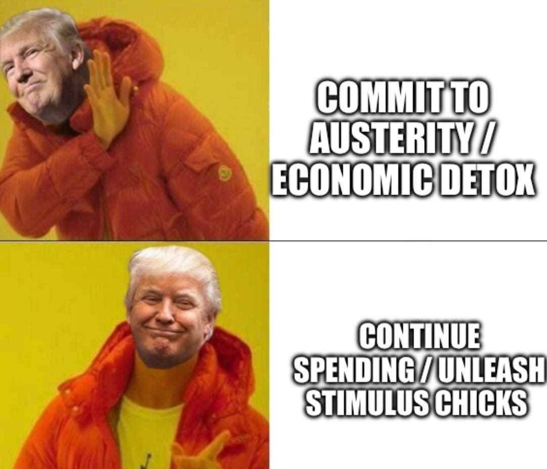 Again, intially coming into the year the administration was adamant on committing to austerity / creating an economic detox, but instead, we’re right back to continuing to blow out deficits further & now floating the idea of potential stimulus checks… ‘21 here we come.