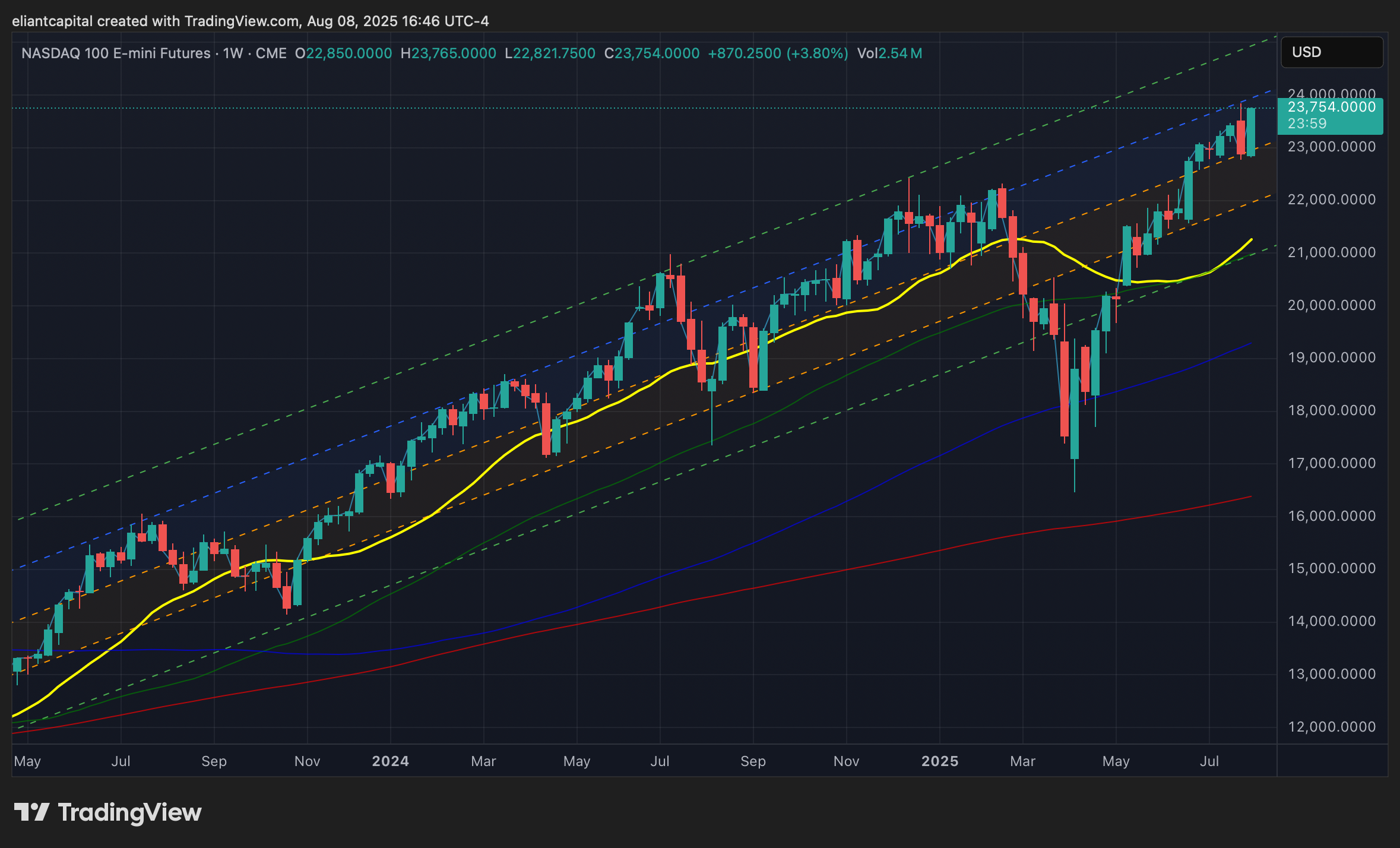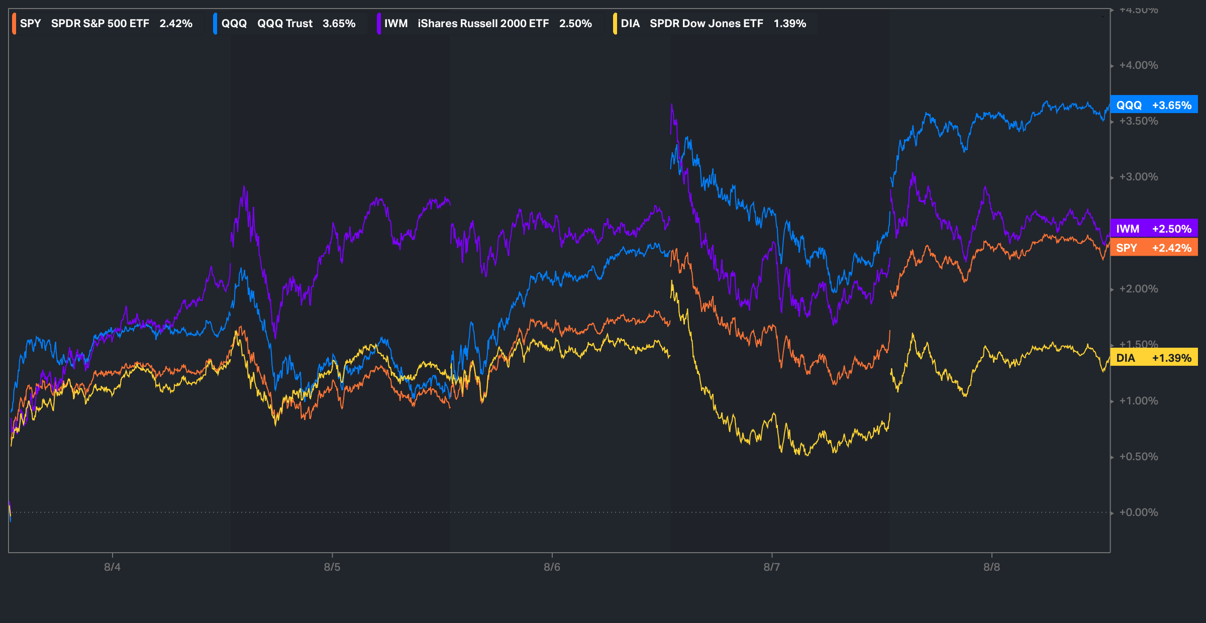 To jump right into Spooz, following back to the prior week, Spooz had finished off the week with a gap down given the softer jobs report along with the large revisions for the months of May & June but into this past week, due to the softer jobs data, rate-cut expectations surging combined with continuous dovish commentary out of Fed speakers helped propel markets higher thus leading all of the indices to finish substantially higher on the week whilst Spooz in itself ended up closing higher by just over 240bps.
