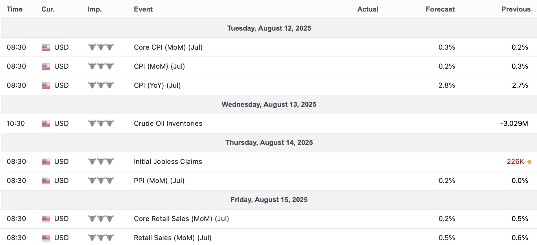 In regard to economic data into the upcoming week, it’s a bit of a busier week compared to last week as we have CPI #’s earlier on in the week with both PPI & Retail Sale #’s taking place in the latter part of the week as well but the other bigger event that will likely have attention drawn towards is the Trump-Putin summit in Alaska taking place on Friday.
