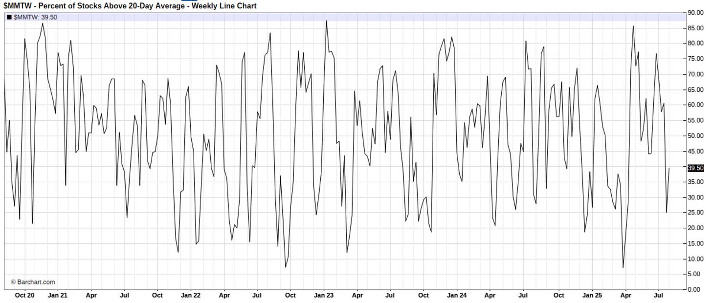 And despite the indices having staged a rally higher this past week, the % of stocks above the 20d still only sits at just 39% which STILL is generally extended on the downside (oversold)… an impressive feat considering both Spooz & the Q’s are essentially sitting within 100bps of ATHs.