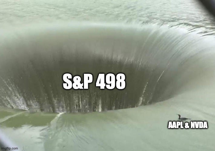 Why is that? Well, as we had talked about this past Thursday but a bigger reason has likely been attributed to capital flowing within a few sets of stocks thus sucking liquidity out of the remainder of the markets… Apple for instance this past week along with Semiconductors / Mag-7 in general which has helped mask the deteriorating breadth / lack of upside participation under the hood thus leaving the % of stocks above the 20D still within oversold territory.