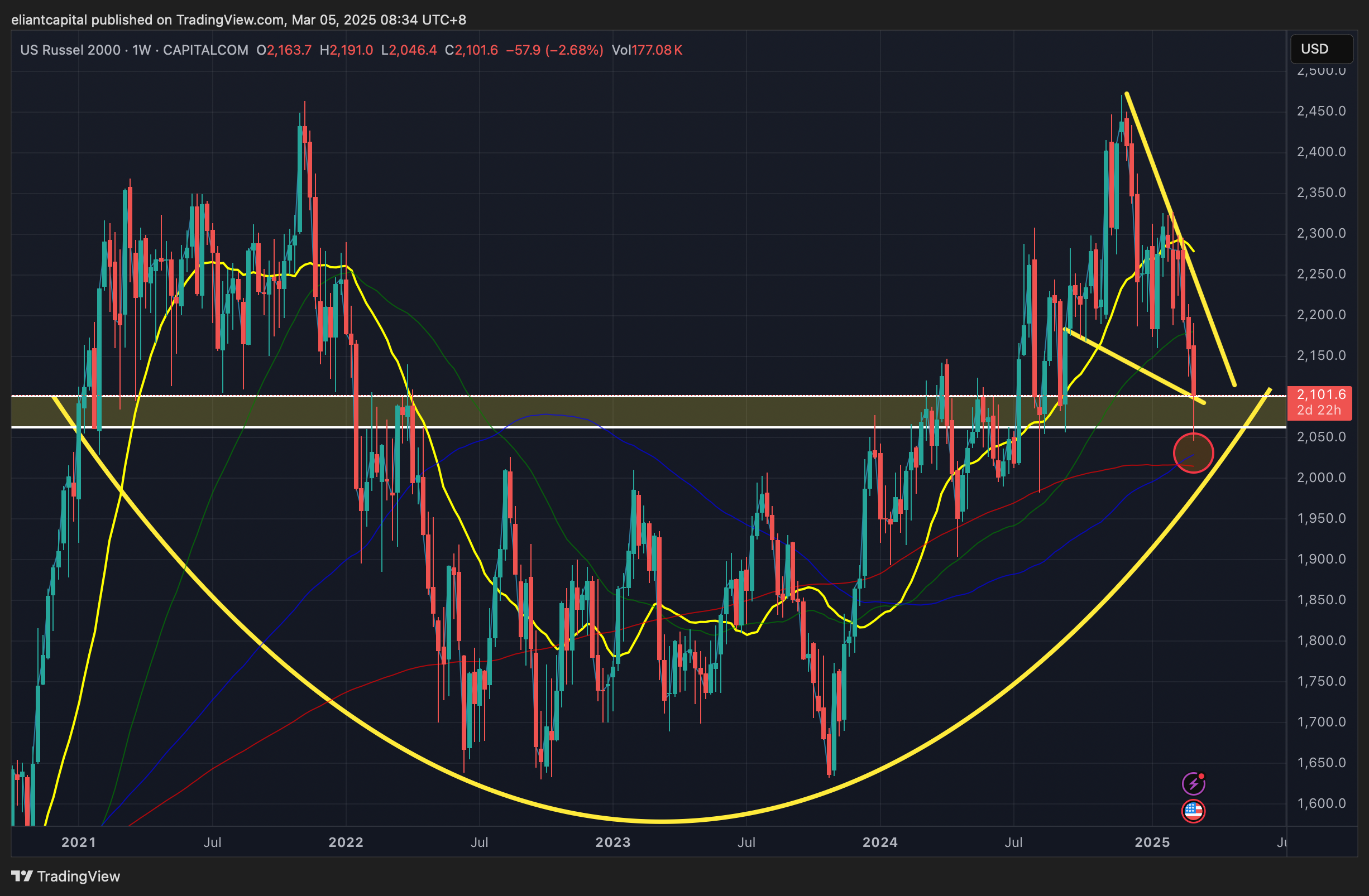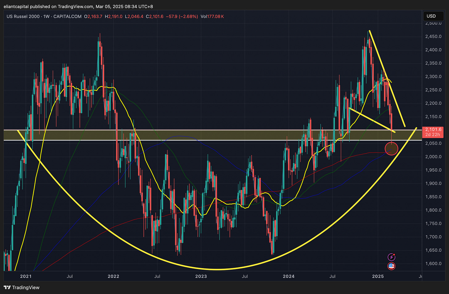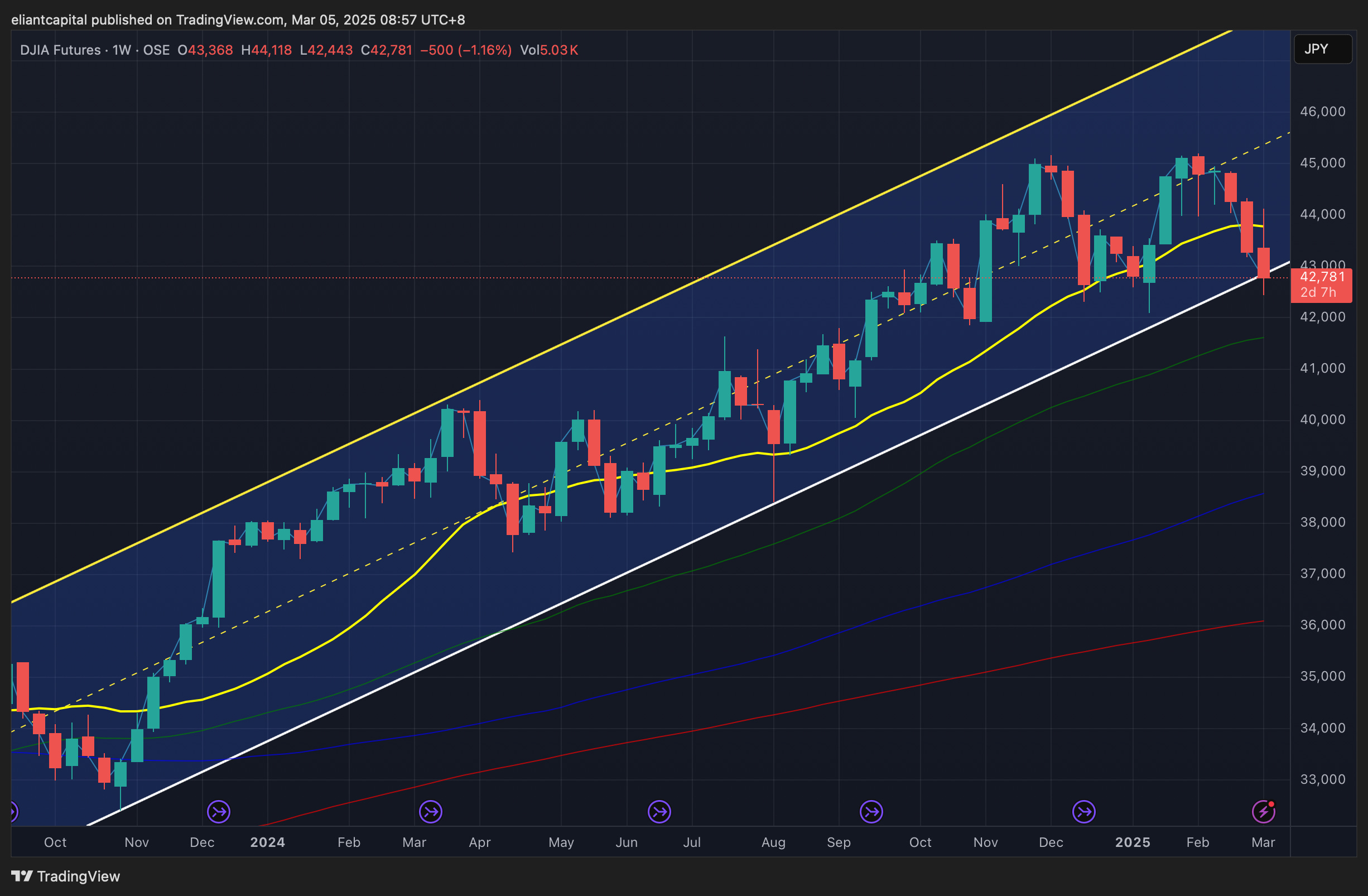 Similar to Spooz, but the Dow is currently teetering on the edge as it sits on the bottom of the upward parallel channel it has remained in since late ‘23… an important weekly close ahead this week for the Dow & all of the indices on that note.