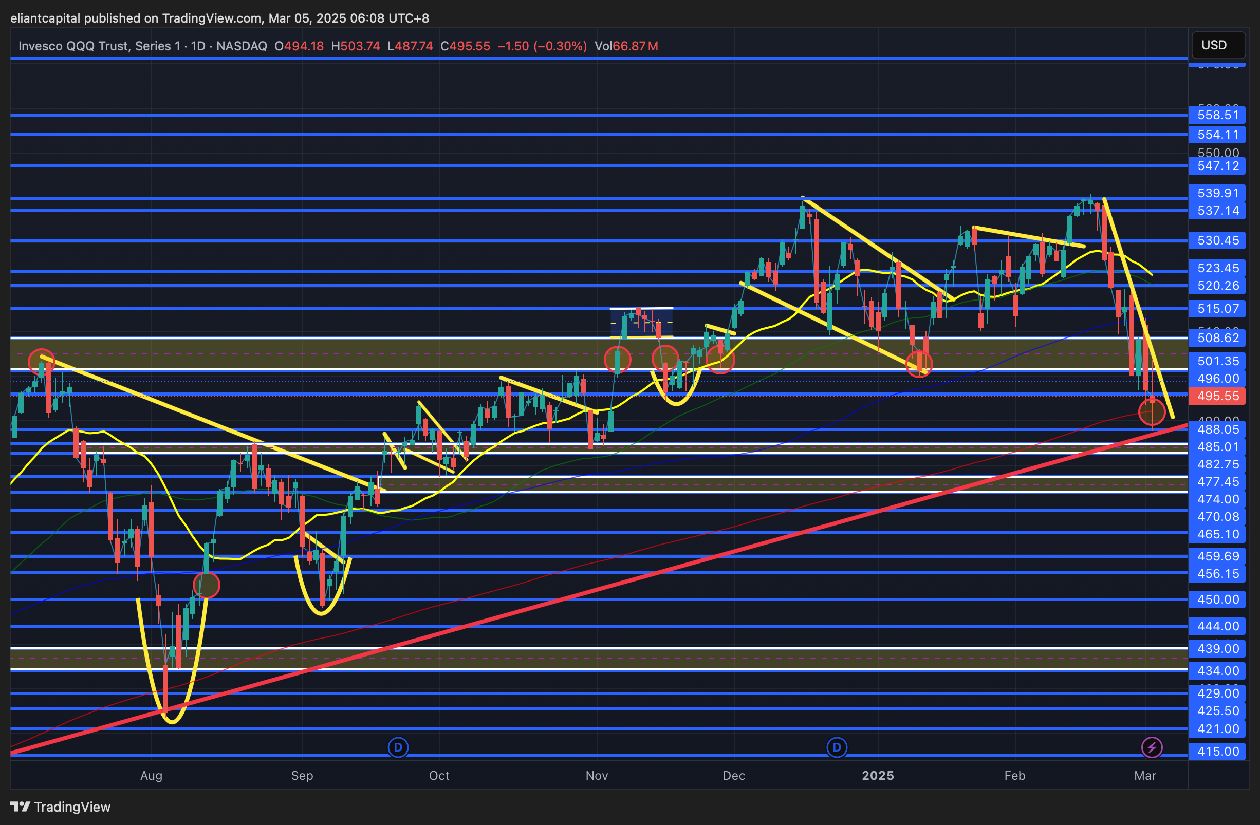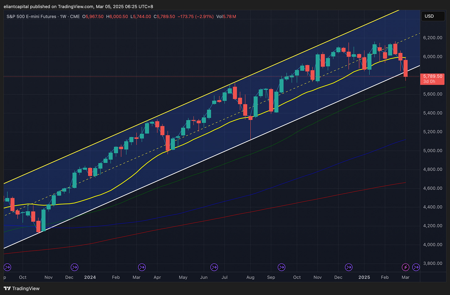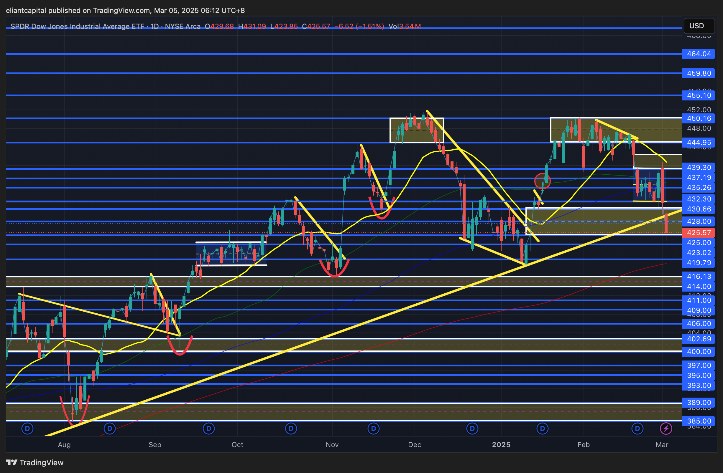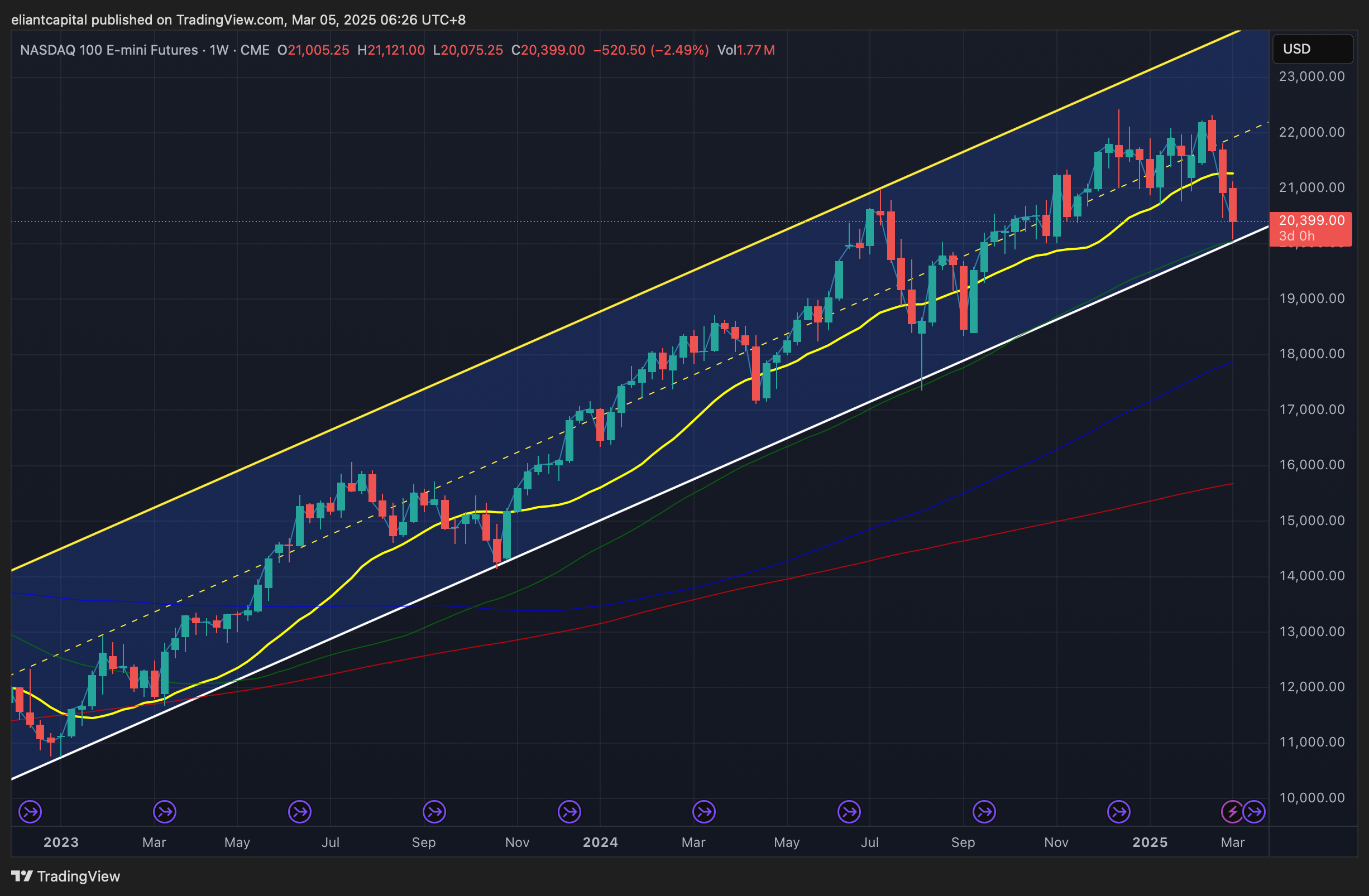 Similar to Spooz, but the Dow is currently teetering on the edge as it sits on the bottom of the upward parallel channel it has remained in since late ‘23… an important weekly close ahead this week for the Dow & all of the indices on that note.