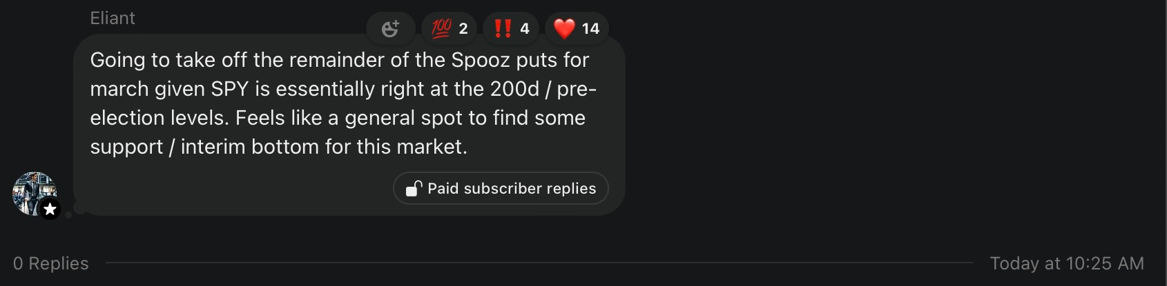 Pretty much turned out to be the the low of day, so not a bad cover there & overall, these hedges worked out fairly well for us. We initially put the hedges on a week before the Deepseek scare in which we then covered half on Deepseek week given the big decline in such a short amount of time & then last week, we once again cut the put spreads in half for a 3X & then today, we sold the remaining 1/4th of the spreads to completely take the hedges off.