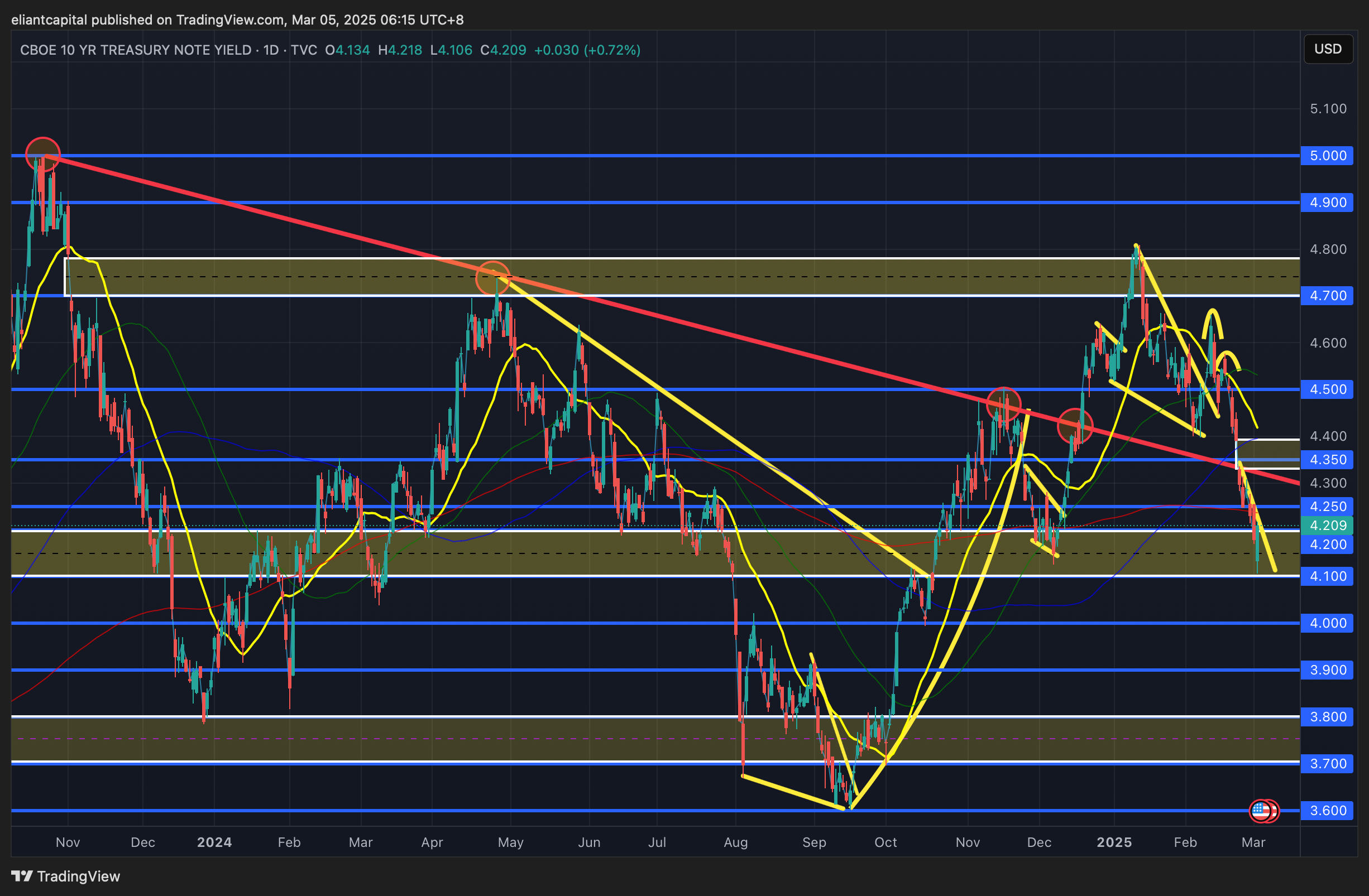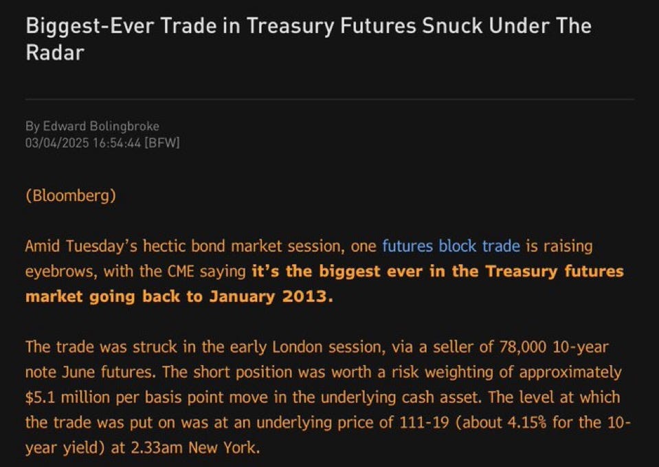 I thought this was interesting as well & felt like it was worth sharing, but quite a large short was put on bonds today… going against the grain of Bessent & the current Admin’s goals, which given the large reversal from 4.1s to nearly mid-4.2s in the matter of hours, they haven’t been too successful given majority of the bid in bonds has been due to panic / flight to safety & a big portion of the recent rally got faded today.