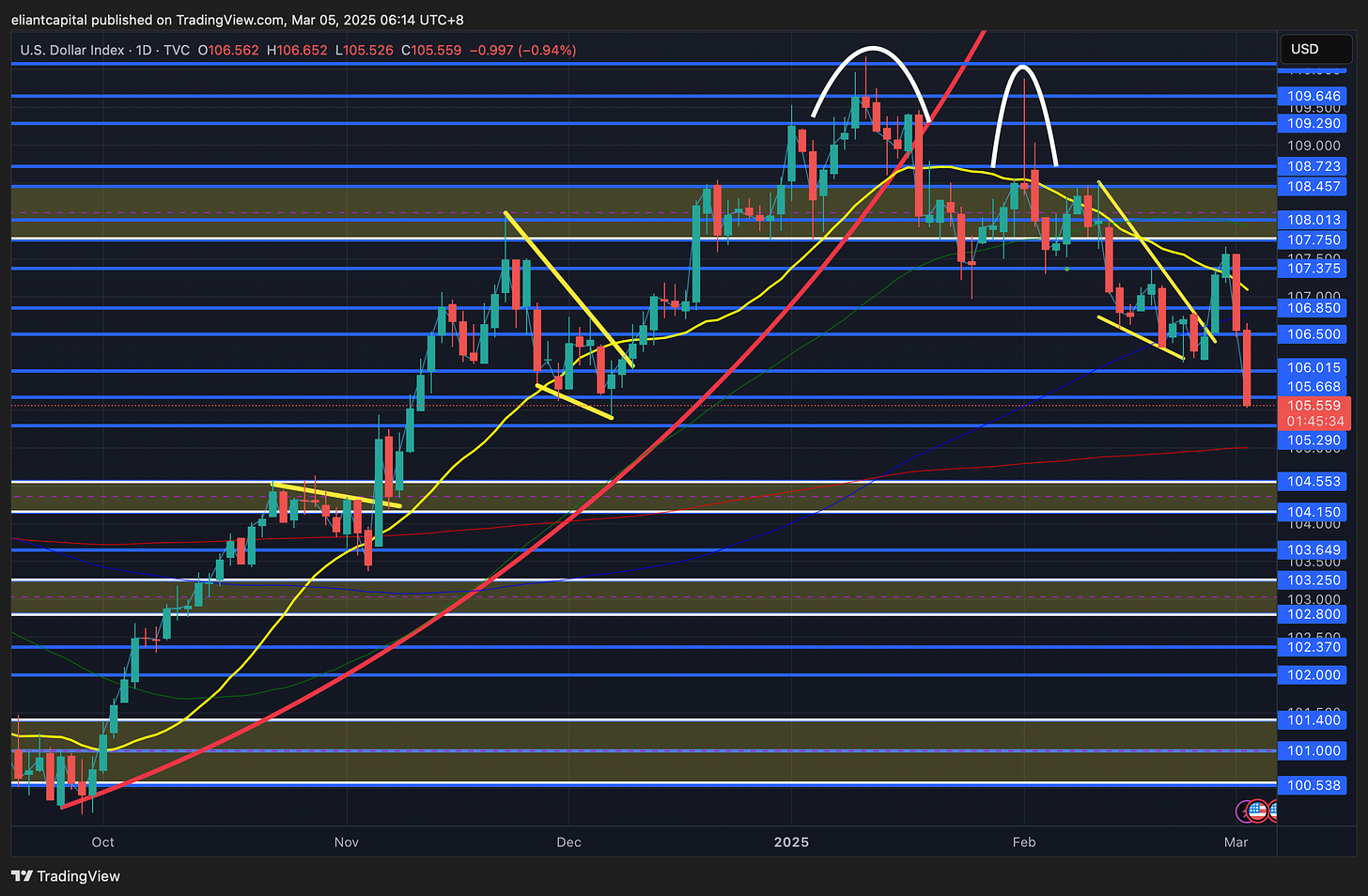 We’ve continued to maintain a bearish stance on the dollar & still do… following after-hours today, again, we received a headline out of Lutnick essentially suggesting that the U.S. will likely look to back off on tariffs if a deal can be reached with Mexico & Canada… granted, this has yet to be 100% confirmed by Trump. Nevertheless, following the headline, both CAD & MXN made highs against the dollar / dollar made lows, so as of now, market does clearly believe the headline. In regard to the other contributing factor towards the weakness in the dollar, again, it circles back to Europe… we’ve been a bull on the Euro despite the continued crowded calls for parity earlier on the year & it was such a “sure trade” but here we are with Europe stepping up & now significantly shifting focus towards fiscal spending which has led to this bigger breakout in the Euro against the dollar hence contributing to the general downside pressures in the dollar. Don’t necessarily see a clear catalyst to shift this momentum anytime soon besides technicals given the 200d sits just below.