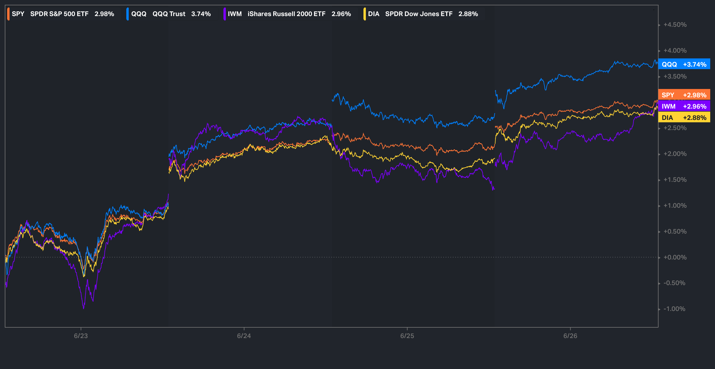 It’s been quite the week for the indices… initially coming into the week, fears & or headline-driven hysteria following the U.S. having joined in on the attack of Iran led indices to dip earlier on in the week & then following the retaliation by Iran, it ended up marking the bottom on the indices for the week as the attack more so was an escalate-to-de-escalate for Iran to save-face & as the week has progressed, focus has shifted towards the dovish flurries / comments by the Fed along with Trump looking for Powell’s replacement already & because of the excitement around dovishness / rate-cuts, indices have continued to trek higher & the Q’s have finally gone on to make a new ATH and are leading the way on the week, currently higher by 374bps, whereas the remaining indices are all inline in terms of performance as they each sit higher by around 300bps on the week.