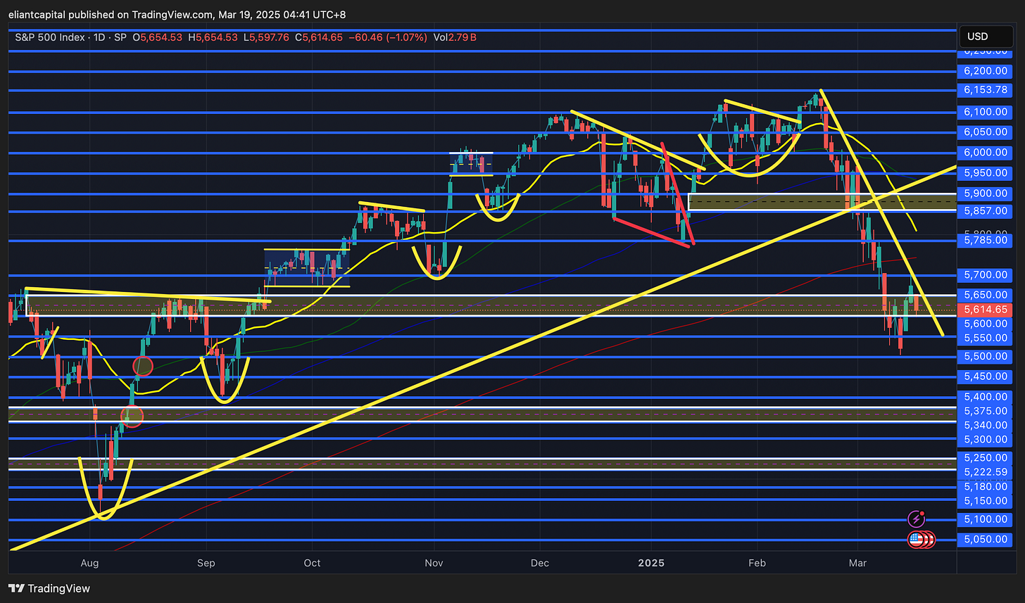 On the contrary, if we were to see recent uncertainties persist / this recent rebound more so shifts into a bear flag, I do think we could end up seeing Spooz flush lower to retest the September lows near 5400ish & thats assuming things escalate fairly aggressively from here… certainly not impossible given how markets have reacted to recent headlines, but in general, if uncertainty in markets persist, do expect volatility to persist right there with it as well.
