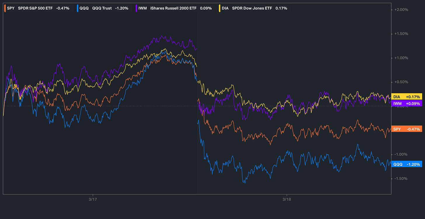 It’s been a fairly quieter week in respect to headlines & economic data, but tomorrow, we have finally reached the long-awaited FOMC day… thus far, the Dow & Small-caps are the only two positive of the indices on the week, granted, they’re essentially flat whereas the Q’s are once again the under-performer on the week which has mostly been driven by the lackluster action amongst Mag-7.
