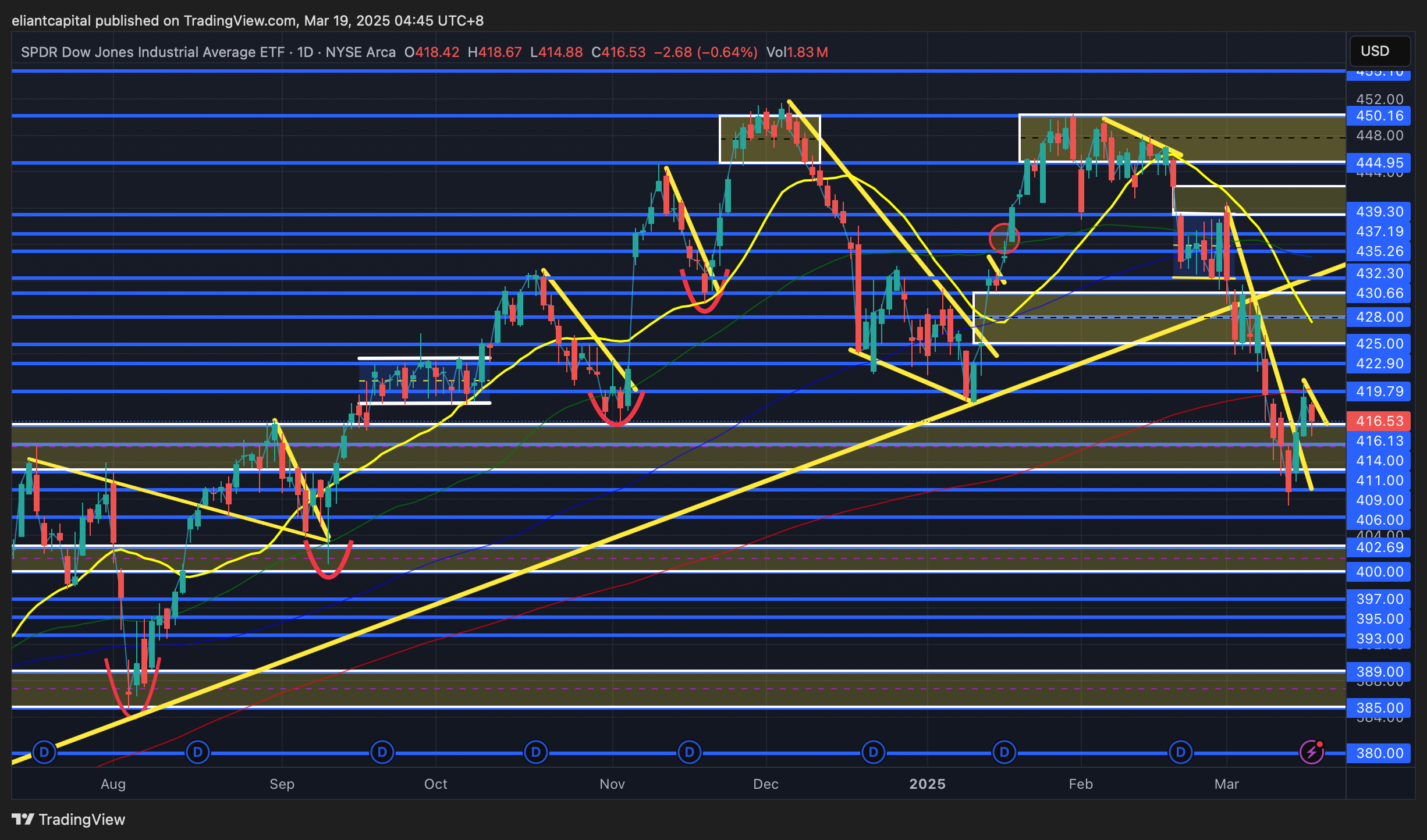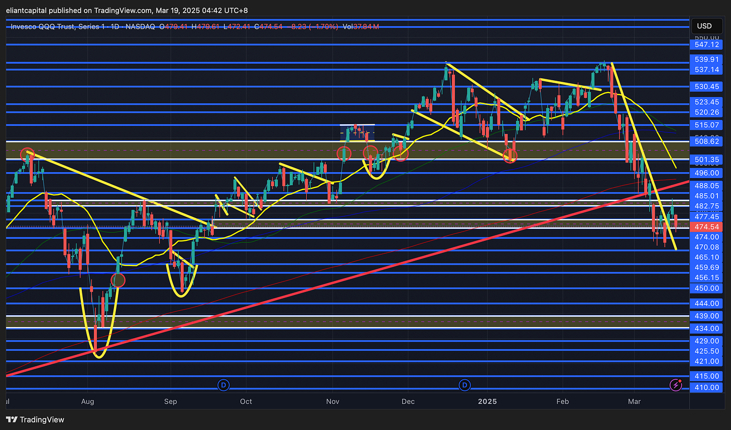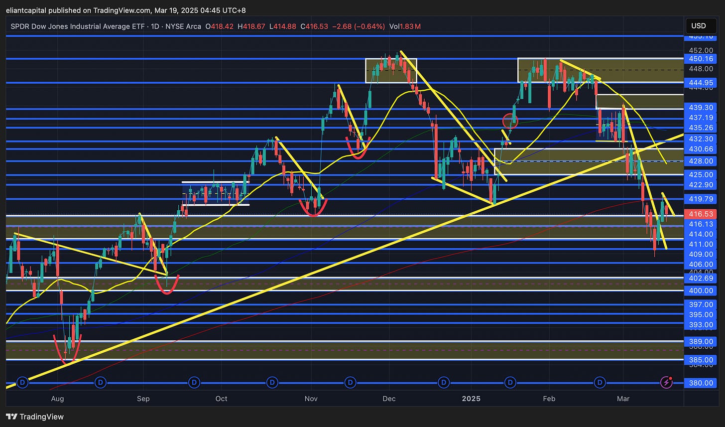 On the contrary, if we were to see DIA continue to reject the 200d above & fail to firmly reclaim 420ish & this more so turns into a potential bear flag before resuming lower, the next bigger line of support is around 402 / 400ish which coincides with the September ‘24 lows… a bit make or break here for indices in general as you could argue all of them are within bear flags & or you could argue all of them are trying to base / find some support & potentially establish a higher lower before resuming higher.