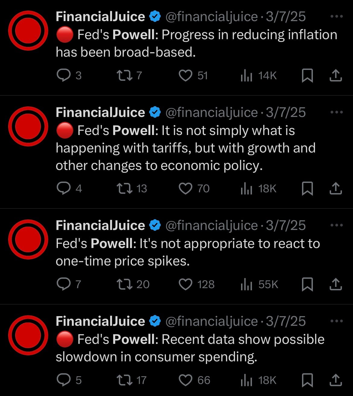 So what’s the takeaway… the first quote shows that Powell is recognizing that inflation has been gradually reduced broadly since January… & if you recall in January, but that was a time when the majority consensus was calling for a second wave of inflation / overheating economy etc… only took two months for that narrative to fade. The next quote shows that Powell isn’t solely focused on the hysteria revolving around tariffs & just below that, Powell acknowledges that one-time price spikes aren’t appropriate to react to (ahem… this is in regard to one-time price spikes from tariffs). Lastly, Powell then recognized the recent slowdown in consumer spending, but did reiterate in that speech that the economy in general is fine.