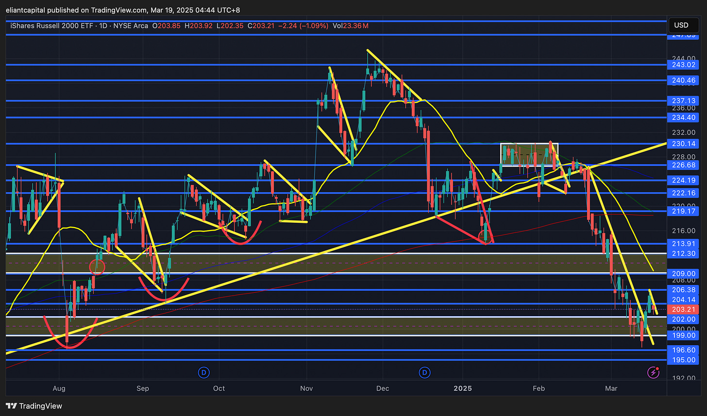 Thus far, the Dow has been the best performing index on the week, granted, it currently sits up just 17bps on the week so essentially flat / trading slightly higher. Not too much has changed for the overall picture, but as of now, DIA found some support this past week right off the Summer ‘24 highs (416 / 411 zone) & in general, I do expect this area to remain as an important pivot as it has potential to be a S/R flip (prior resistance flipping to support). DIA did have a nice rally yesterday, but did end up faltering on the upside & rejecting the 200d from below… clear pivot that bulls need to reclaim, as otherwise, bears will still remain firmly in control. If we were to see DIA form a higher low / break out of this interim flag & go on to reclaim the 200d above, I do think we could see DIA push further to the upside towards 425 / 430ish (20d within range) before then pausing & or deciding where to go from there. If the countertrend rally were to extend, again, the biggest question as we’ve discussed is if it will be a rally to sell into / degross longs & start to look to add shorts & or if the trek to new ATHs continues… still continues to depend on recent uncertainties regarding policy getting resolved / economic & or labor market data continuing to hold up & of course, FOMC tomorrow as well.